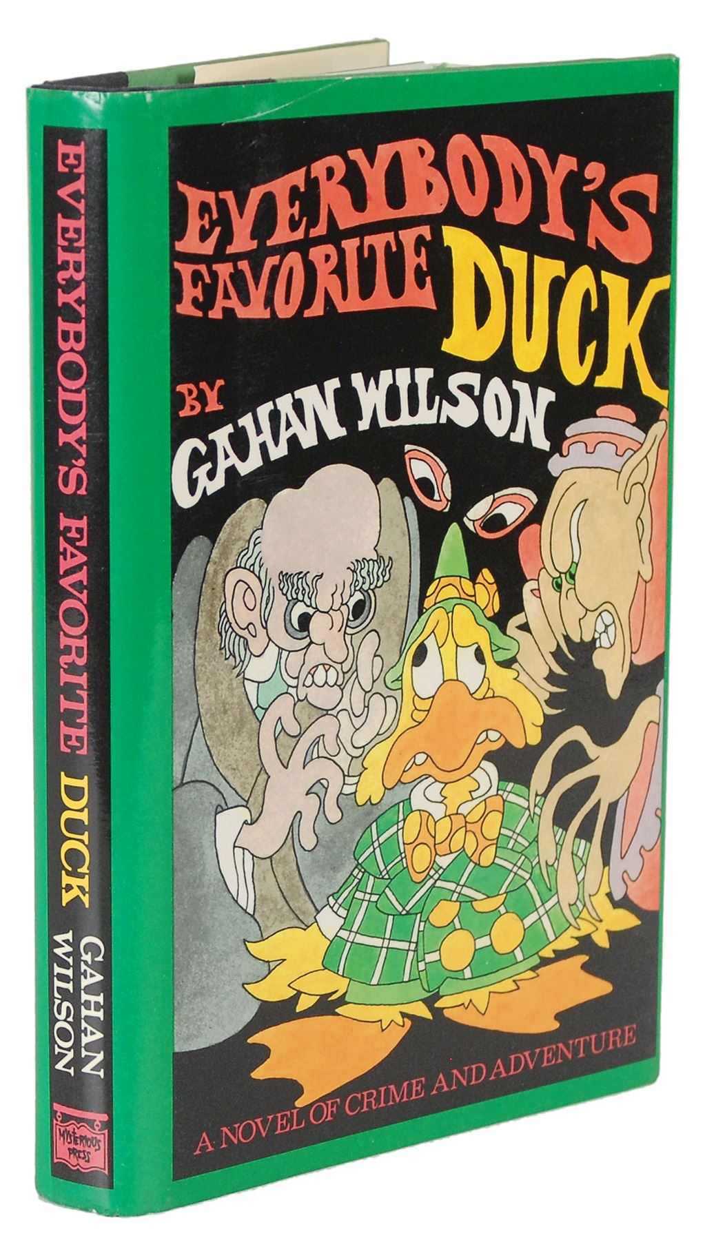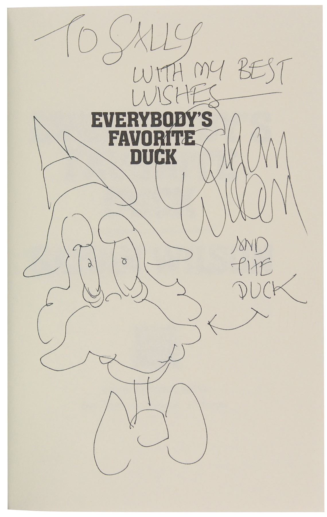 American cartoonist (born 1930) best known for his drawings for The New Yorker. Signed book: Everybody’s Favorite Duck. First edition, first printing. NY: The Mysterious Press, 1988. Hardcover with dust jacket, 5.5 x 8.5, 202 pages. Signed and inscribed on the half-title page, “To Sally with my best wishes, Gahan Wilson and The Duck,” adding a nice sketch of the book’s main character. In fine condition, with a slice to the top border of the dust jacket.