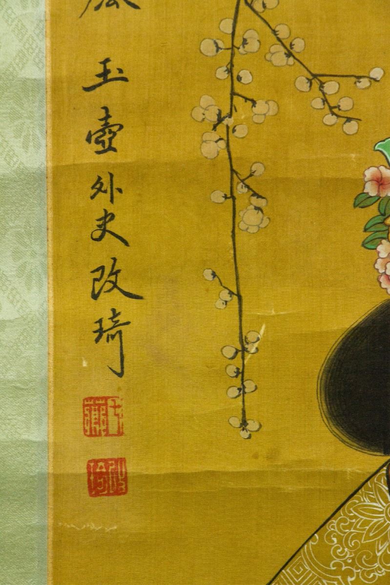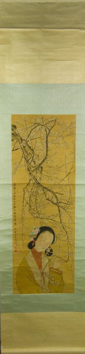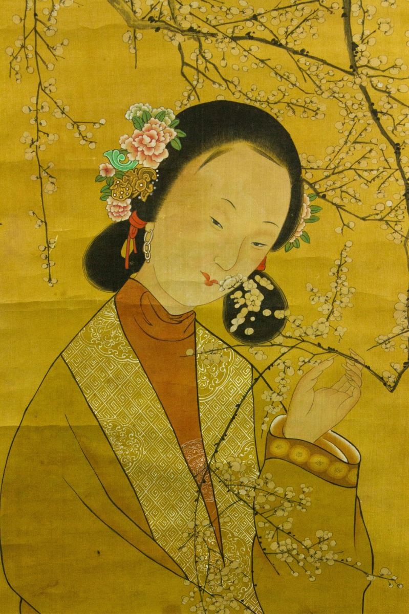 Lady figure under plum blossom tree; Chinese ink and watercolour on silk; hanging scroll; signed Gai Qi and inscribed with two artist seals; 110 cm x 38 cm