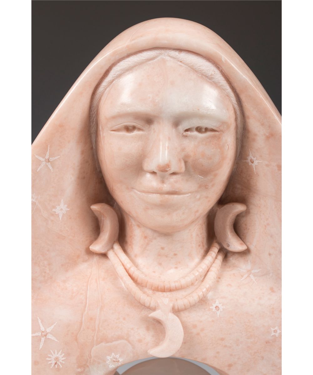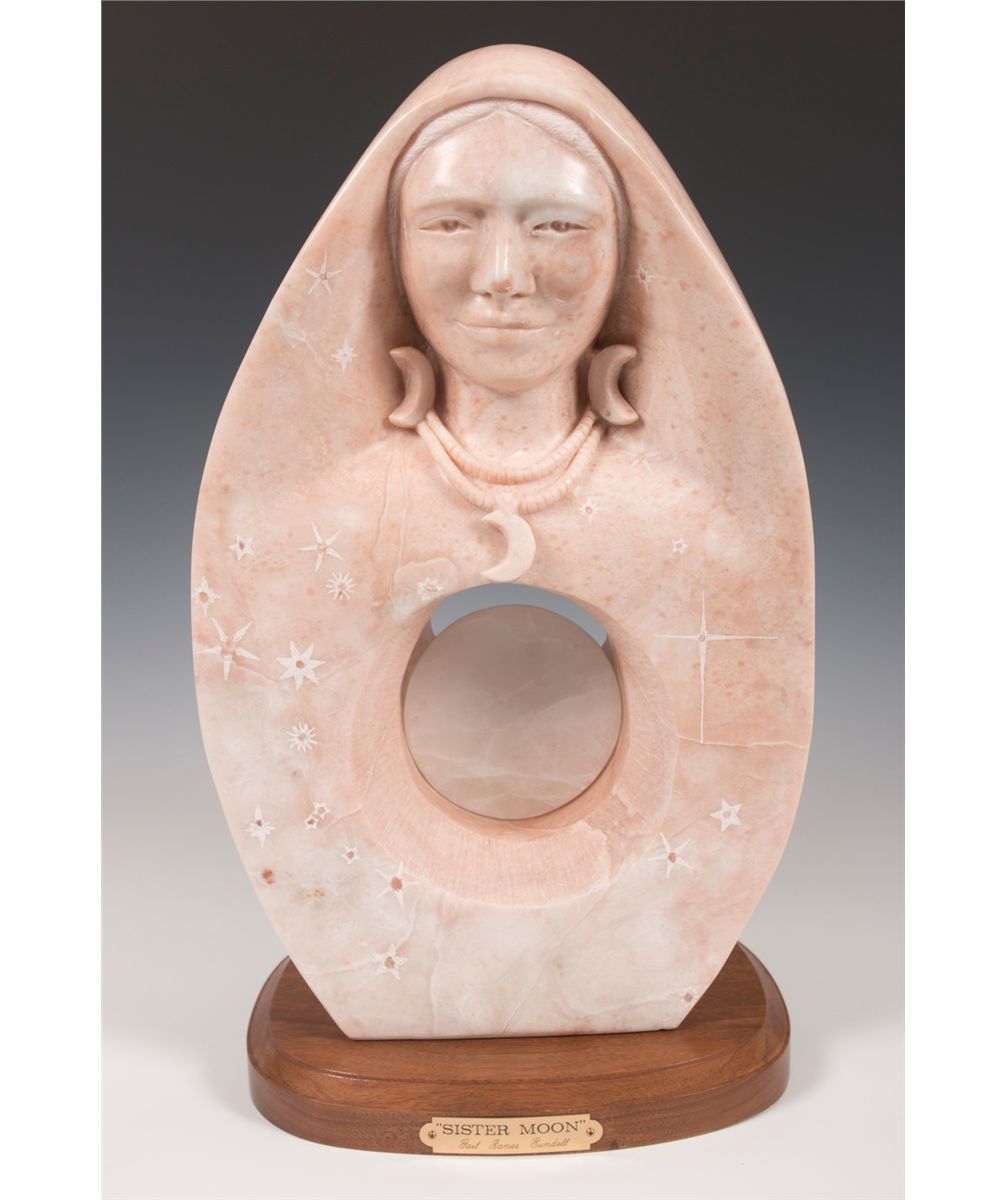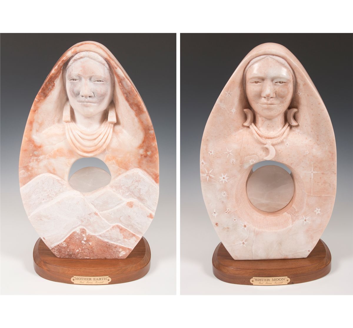 Gail Jones Sundell (20th/21st centuries). Mother Earth and Sister Moon. 19.5" x 12" x 6" double-faced alabaster. Inscribed: G Sundell 2005 [cypher]. Provenance: Estate of Ken Holm, Denver, CO.