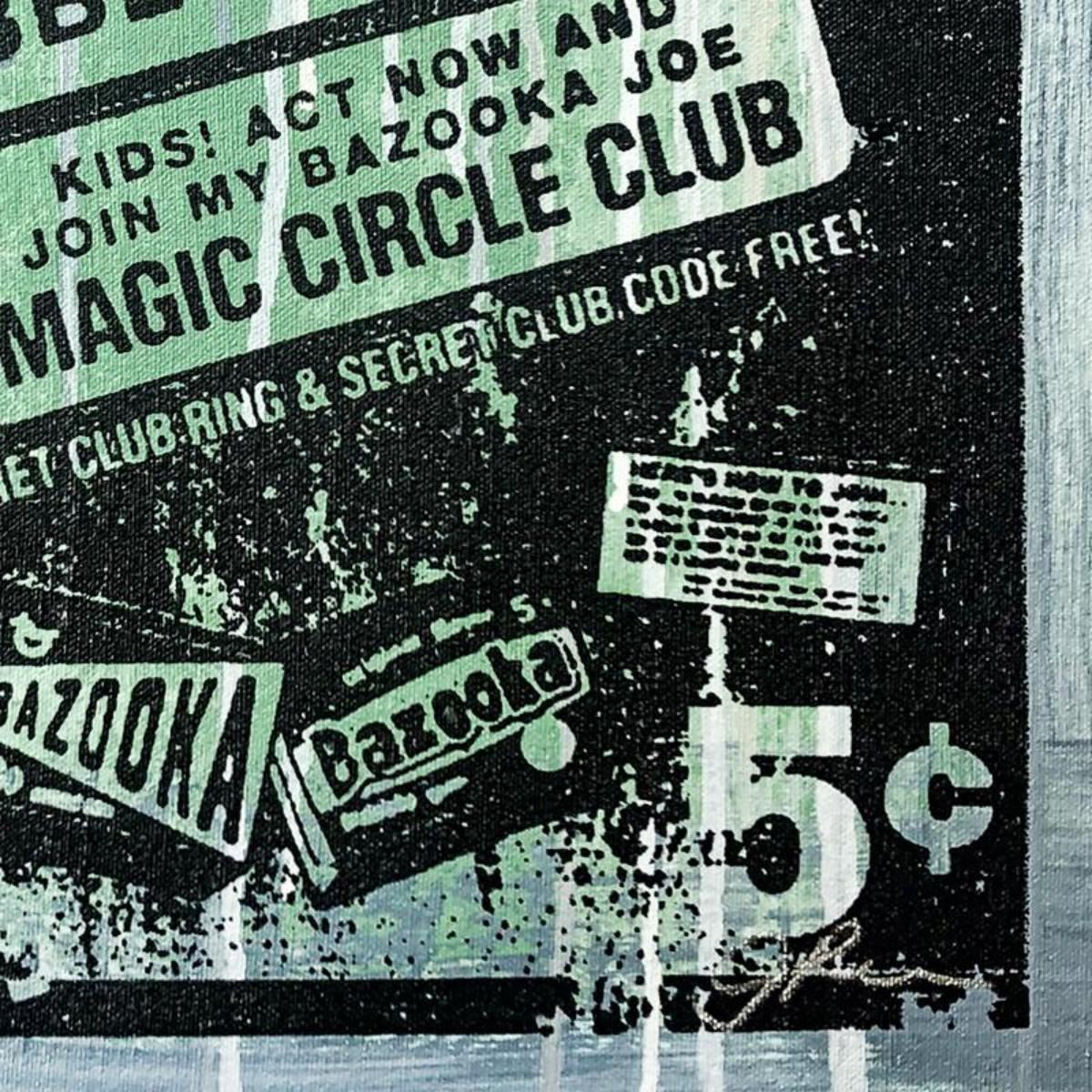 "Bazooka Joe" is an original hand pulled silkscreen and acrylic painting on canvas by Gail Rodgers. Hand signed by the artist, the piece comes with a letter of authenticity. This piece is meant to be gallery wrapped and measure approximately 23" x 23" and image dimensions (after stretching) 16" x 16" (image). Reference #: 243884