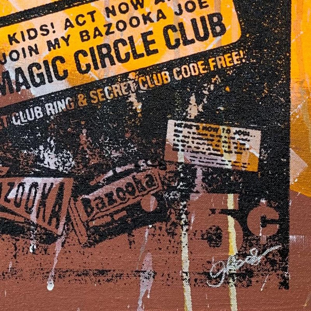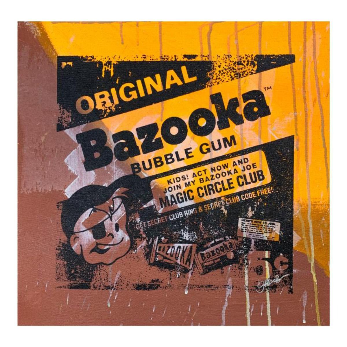 "Bazooka Joe" is an original hand pulled silkscreen and acrylic painting on canvas by Gail Rodgers. Hand signed by the artist, the piece comes with a letter of authenticity. This piece is meant to be gallery wrapped and measure approximately 23" x 23" and image dimensions (after stretching) 16" x 16" (image). Reference #: 244451