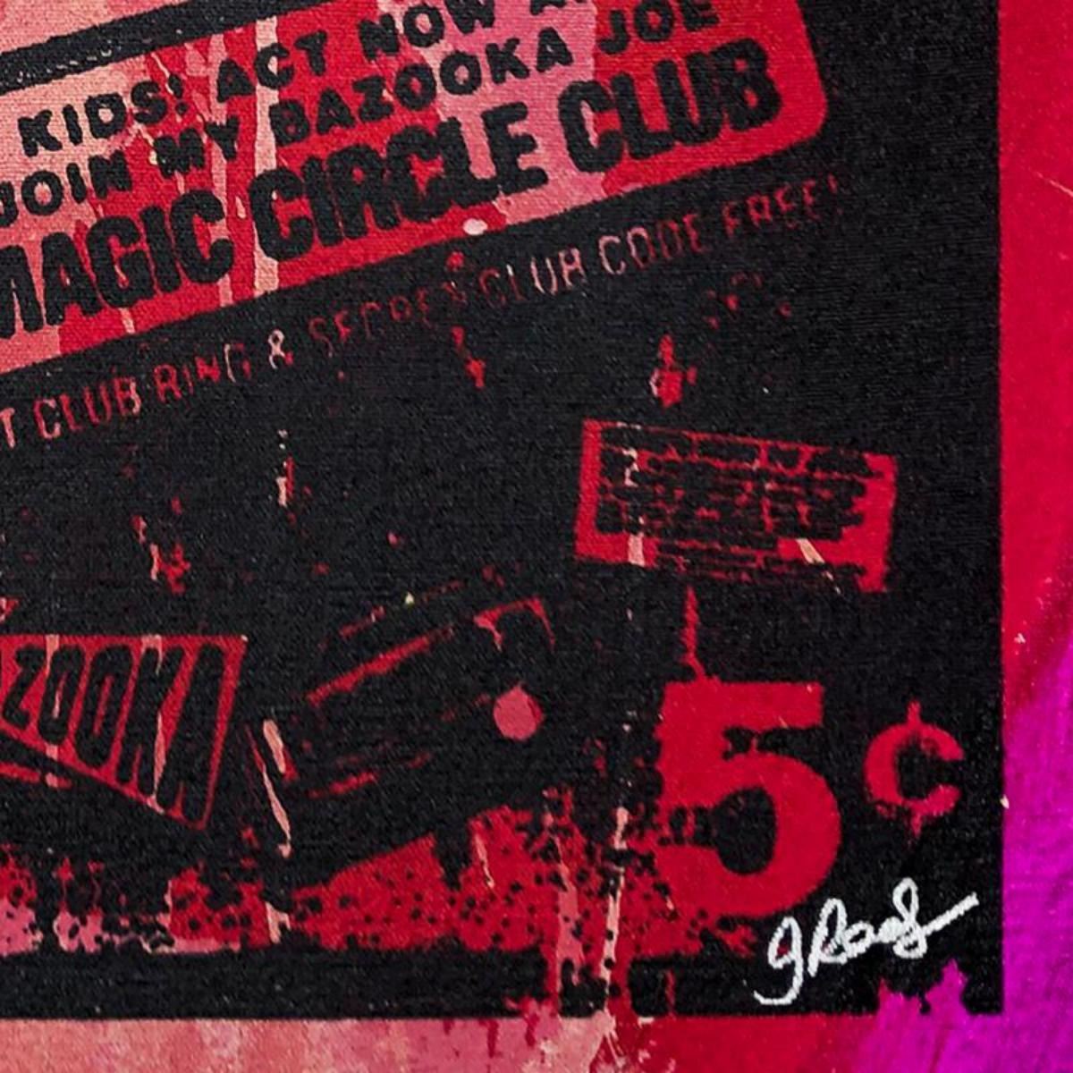 "Bazooka Joe" is an original hand pulled silkscreen and acrylic painting on canvas by Gail Rodgers. Hand signed by the artist, the piece comes with a letter of authenticity. This piece is meant to be gallery wrapped and measure approximately 23" x 23" and image dimensions (after stretching) 16" x 16" (image). Reference #: 244437