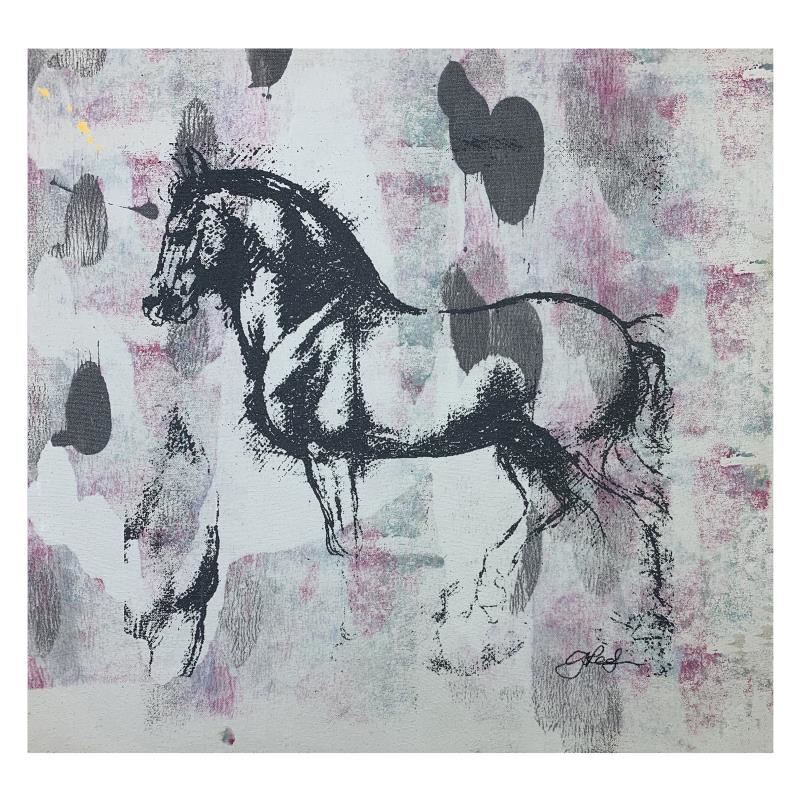 "Leonardo's Horse" is an original hand pulled silkscreen and acrylic painting on canvas by Gail Rodgers. Hand signed by the artist, the piece comes with a letter of authenticity. This piece is meant to be gallery wrapped and measure approximately 23" x 23" and image dimensions (after stretching) 16" x 16" (image).