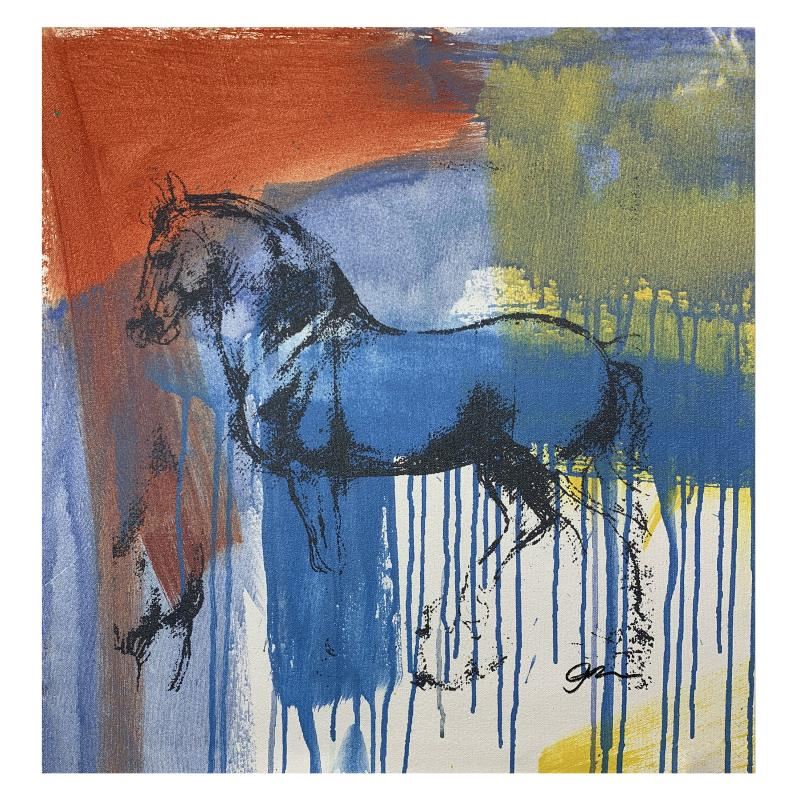 "Leonardo's Horse" is an original hand pulled silkscreen and acrylic painting on canvas by Gail Rodgers. Hand signed by the artist, the piece comes with a letter of authenticity. This piece is meant to be gallery wrapped and measure approximately 23" x 23" and image dimensions (after stretching) 16" x 16" (image).
