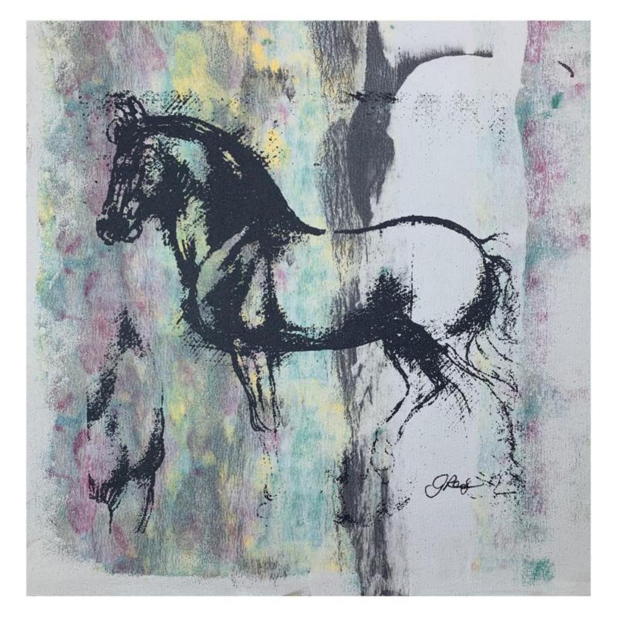 "Leonardo's Horse" is an original hand pulled silkscreen and acrylic painting on canvas by Gail Rodgers. Hand signed by the artist, the piece comes with a letter of authenticity. This piece is meant to be gallery wrapped and measure approximately 23" x 23" and image dimensions (after stretching) 16" x 16" (image). Reference #: 245161