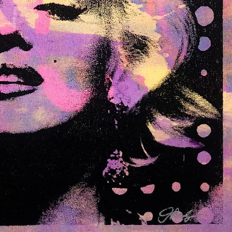 "Marilyn Monroe" is an original hand pulled silkscreen and acrylic painting on canvas by Gail Rodgers. Hand signed by the artist, the piece comes with a letter of authenticity. This piece is meant to be gallery wrapped and measure approximately 23" x 23" and image dimensions (after stretching) 16" x 16" (image).