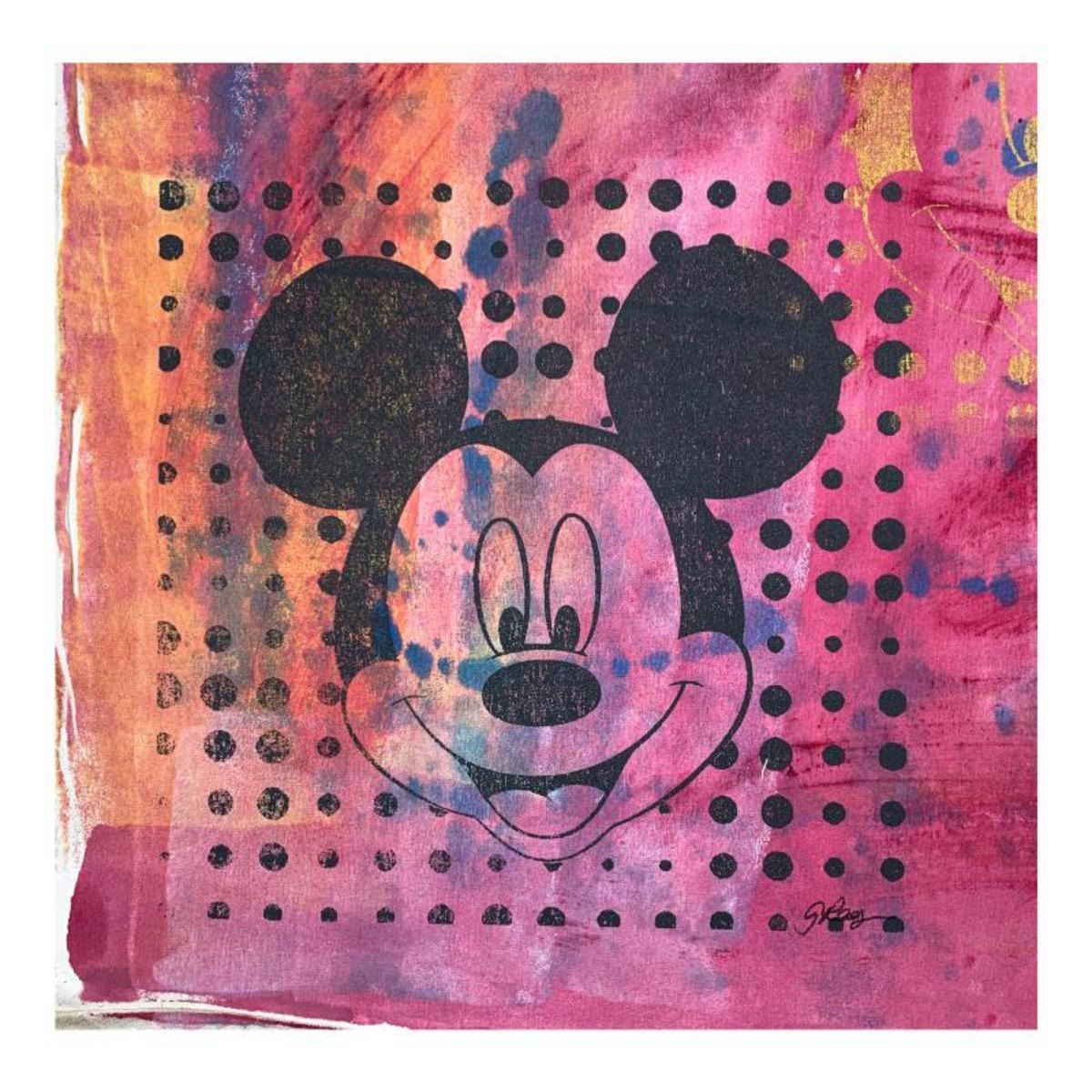 "Mickey Mouse" is an original hand pulled silkscreen and acrylic painting on canvas by Gail Rodgers. Hand signed by the artist, the piece comes with a letter of authenticity. This piece is meant to be gallery wrapped and measure approximately 23" x 23" and image dimensions (after stretching) 16" x 16" (image). Reference #: 244462