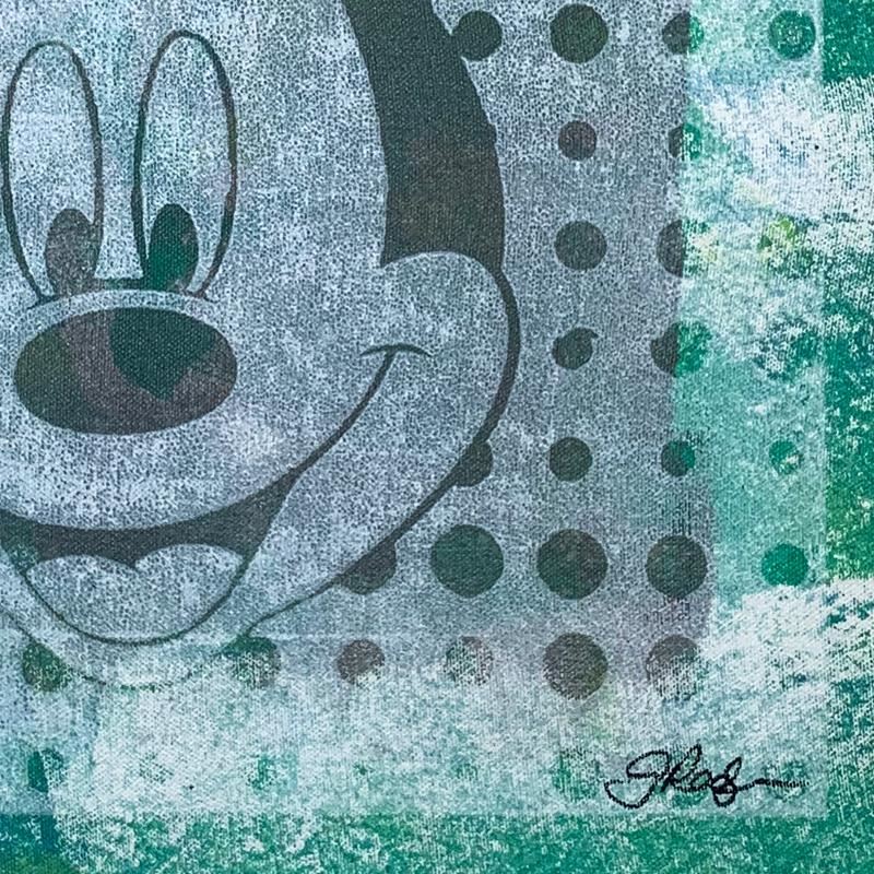 "Mickey Mouse" is an original hand pulled silkscreen and acrylic painting on canvas by Gail Rodgers. Hand signed by the artist, the piece comes with a letter of authenticity. This piece is meant to be gallery wrapped and measure approximately 23" x 23" and image dimensions (after stretching) 16" x 16" (image).