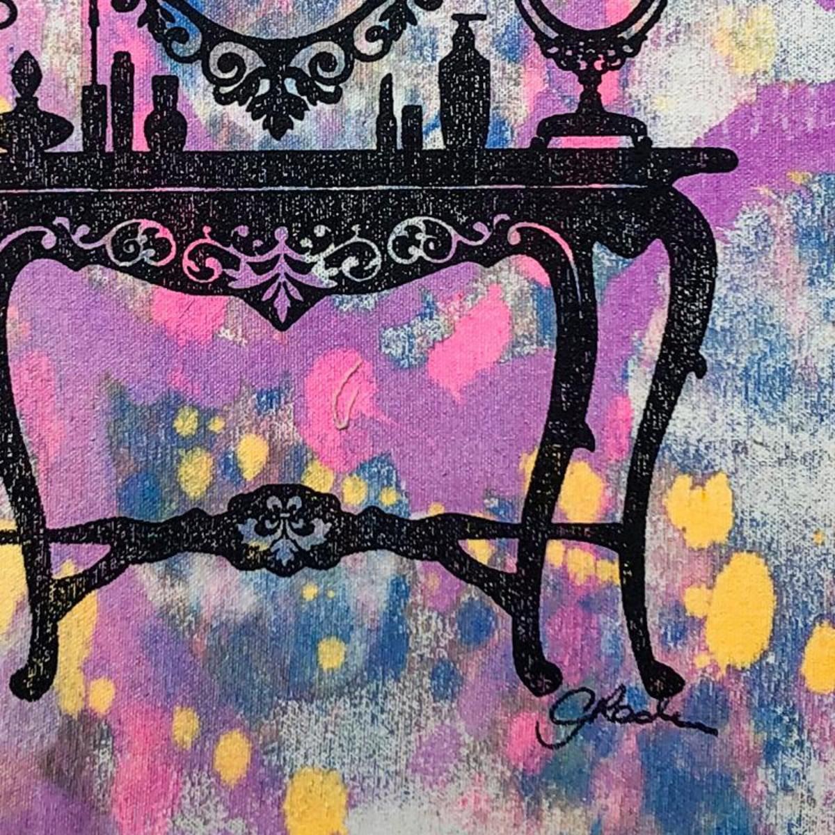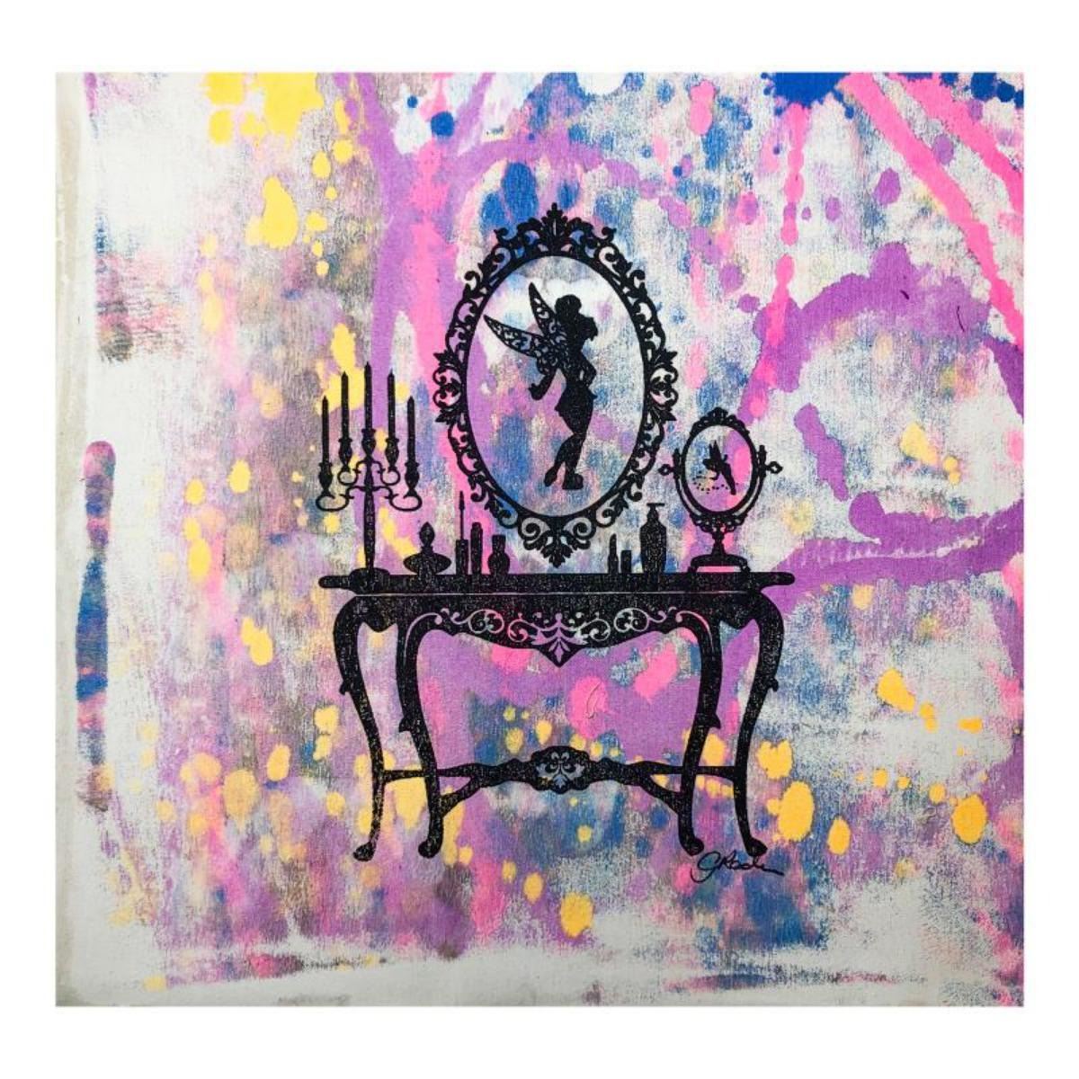 "Mirror Mirror (Tink)" is an original hand pulled silkscreen and acrylic painting on canvas by Gail Rodgers. Hand signed by the artist, the piece comes with a letter of authenticity. This piece is meant to be gallery wrapped and measure approximately 23" x 23" and image dimensions (after stretching) 16" x 16" (image). Reference #: 244414