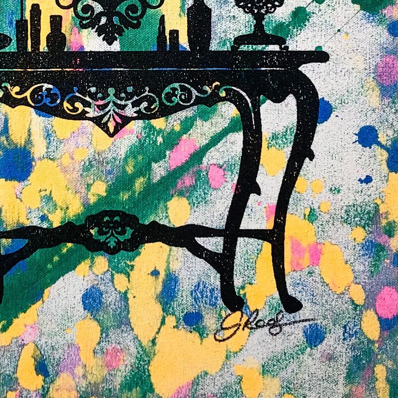 "Mirror Mirror (Minnie)" is an original hand pulled silkscreen and acrylic painting on canvas by Gail Rodgers. Hand signed by the artist, the piece comes with a letter of authenticity. This piece is meant to be gallery wrapped and measure approximately 23" x 23" and image dimensions (after stretching) 16" x 16" (image).