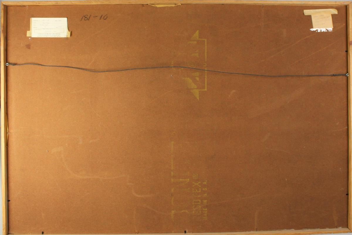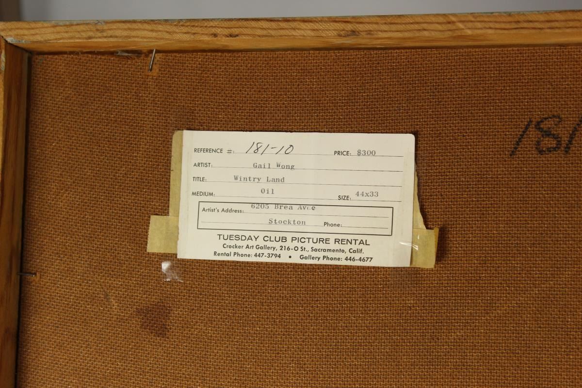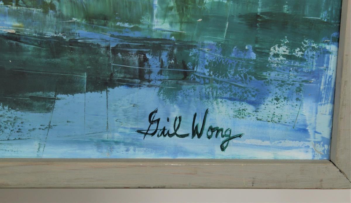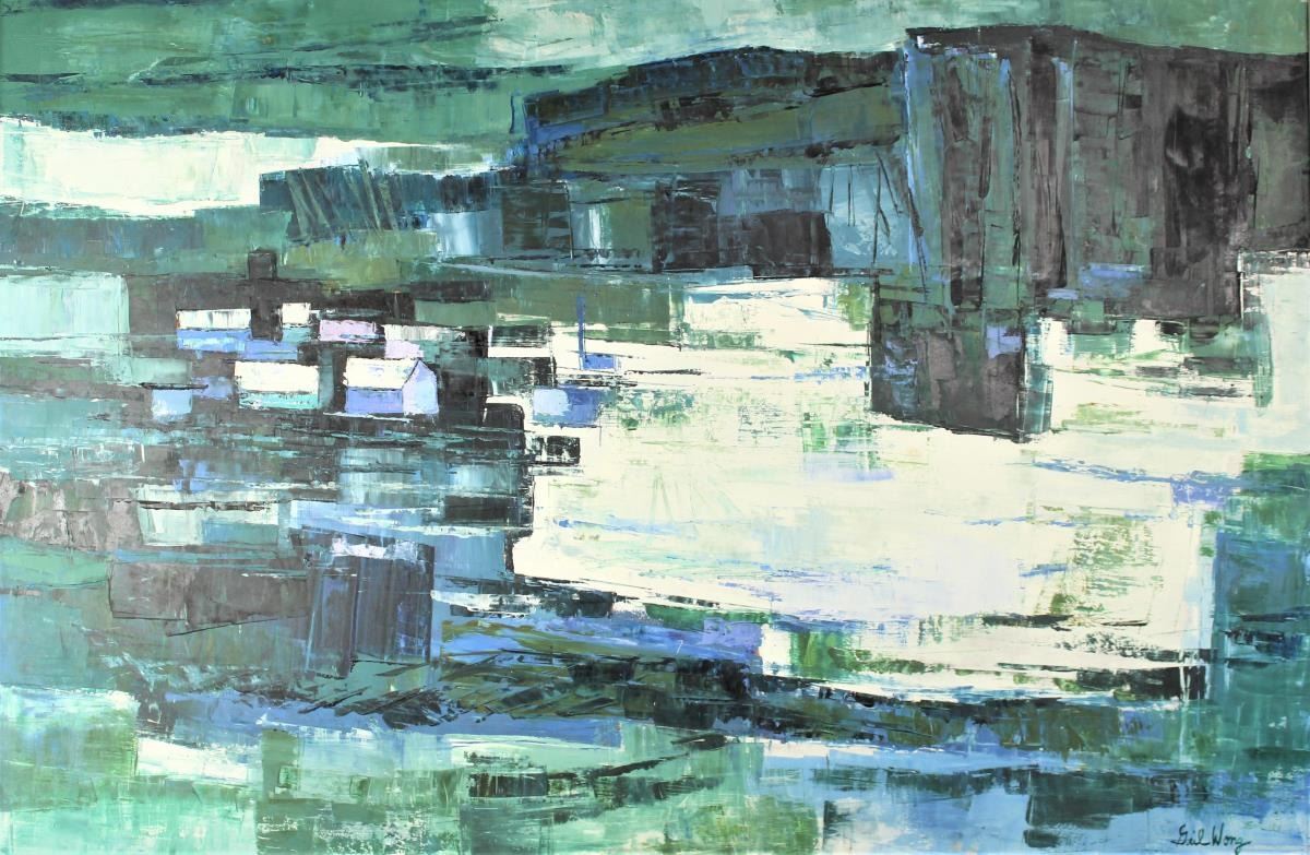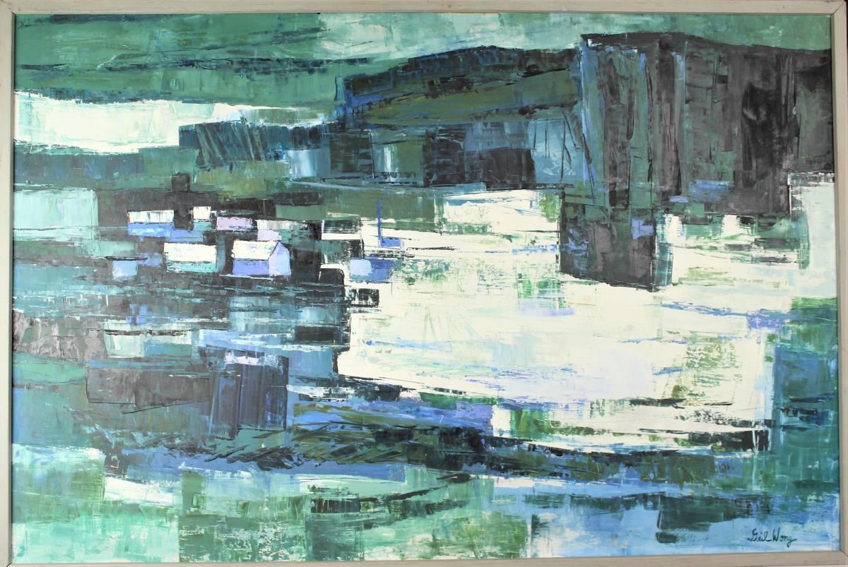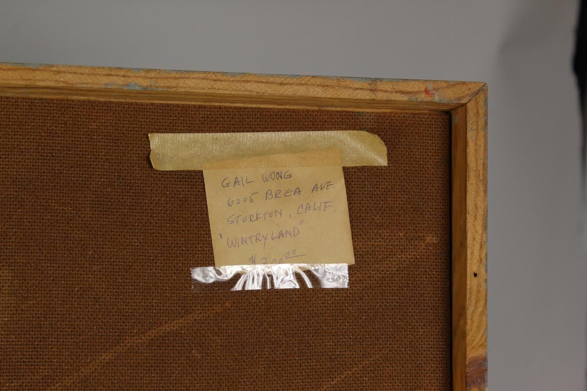 Large abstract titled "Wintryland" with label on the back. Gail Wong studied at the BMFA school. She taught at UC Berkeley. She has a graduate degree in architecture.