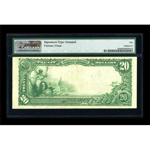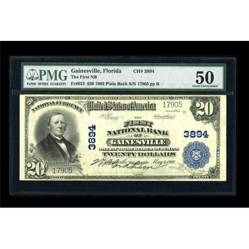 <B>Gainesville, FL</B></I> - $20 1902 Plain Back Fr. 652 <B>The First NB</B></I> Ch. # 3894<BR> A lovely piece from a none too common bank in large size. Typically for the Sunshine State Collection's holdings, this example is the highest grade large note known from any of Gainesville's three issuing banks. PMG has graded this boldly signed note <B>About Uncirculated 50,</B></I> and it will certainly be highly contested before the hammer falls this evening. <BR><I>From The Sunshine State Collection.</B></I><BR><BR><b>Shipping:</b> Coins & Currency (<a target="_blank" href="http://www.heritageauctions.com/common/shipping.php">view shipping information</a>)