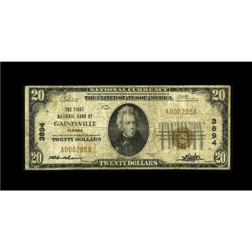 <B>Gainesville, FL</B></I> - $20 1929 Ty. 1 <B>The First NB</B></I> Ch. # 3894<BR>When this note was reported to the census takers a long time ago the grade was not given. The signature of W.S. Graham as cashier is easy to read, while the elaborate presidential signature is of H.E. Taylor. <B>Very Good.</B></I><BR><BR><b>Shipping:</b> Coin/Currency (<a target="_blank" href="http://www.heritageauctions.com/common/shipping.php">view shipping information</a>)