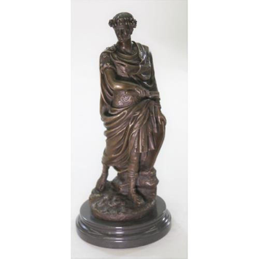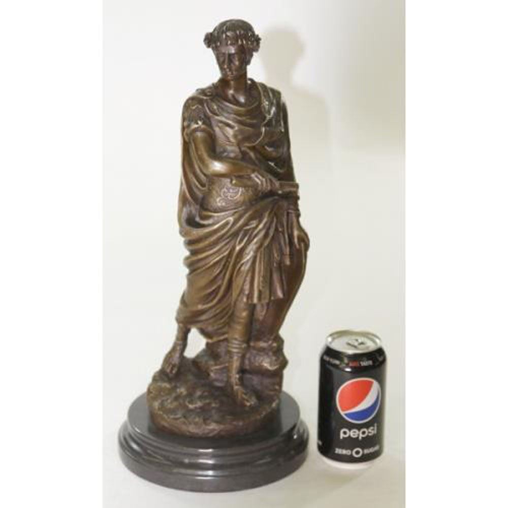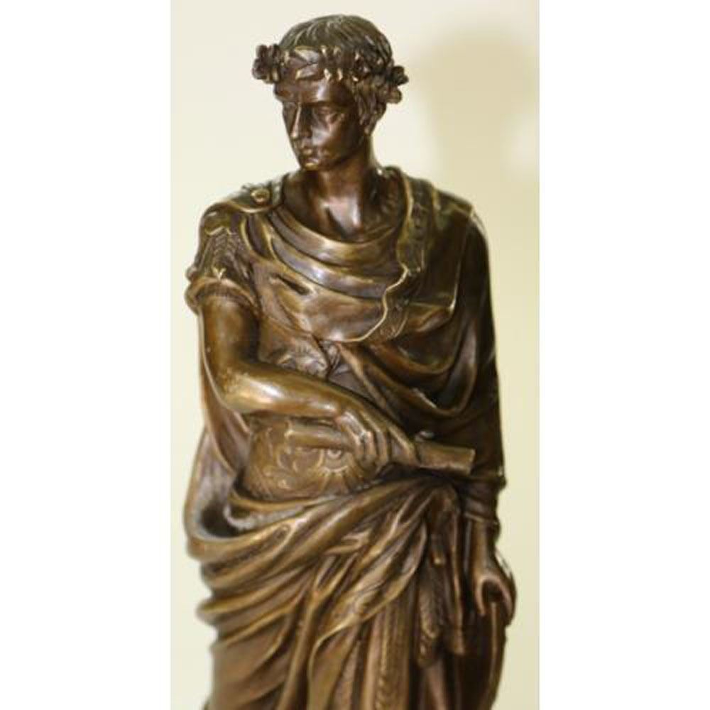 This is a bronze sculpture honoring the eminent Gaius Julius Caesar 13 July 100 BC to 15 March 44 BC. Who was a Roman general and statesman. He played a critical role in the gradual conversion of the Roman Republic into the Roman Empire. He began extensive reforms of Roman society and government. He centralised the bureaucracy of the Republic and was eventually proclaimed dictator in perpetuity. He is seen here in his unrivaled power wearing a generals attire. He wears the chest armor, over what would have been, a wool tunic in a deep purple as used in martial triumphs. He holds a scepter, which is a symbolic ornamental rod or wand borne, in his left hand, significant of a ruling monarch as an item of royal or imperial insignia. His face looks out boldly to the cheering masses, raising his hand in acknowledgment. This icon of the ages was molded using the age old methods of lost wax casting and stained with a brown patina finish and stands upon a marble base. Bronze Dimensions with Marble Base: Height 17 X Width 8 Inches. Weight: 17 LBS.