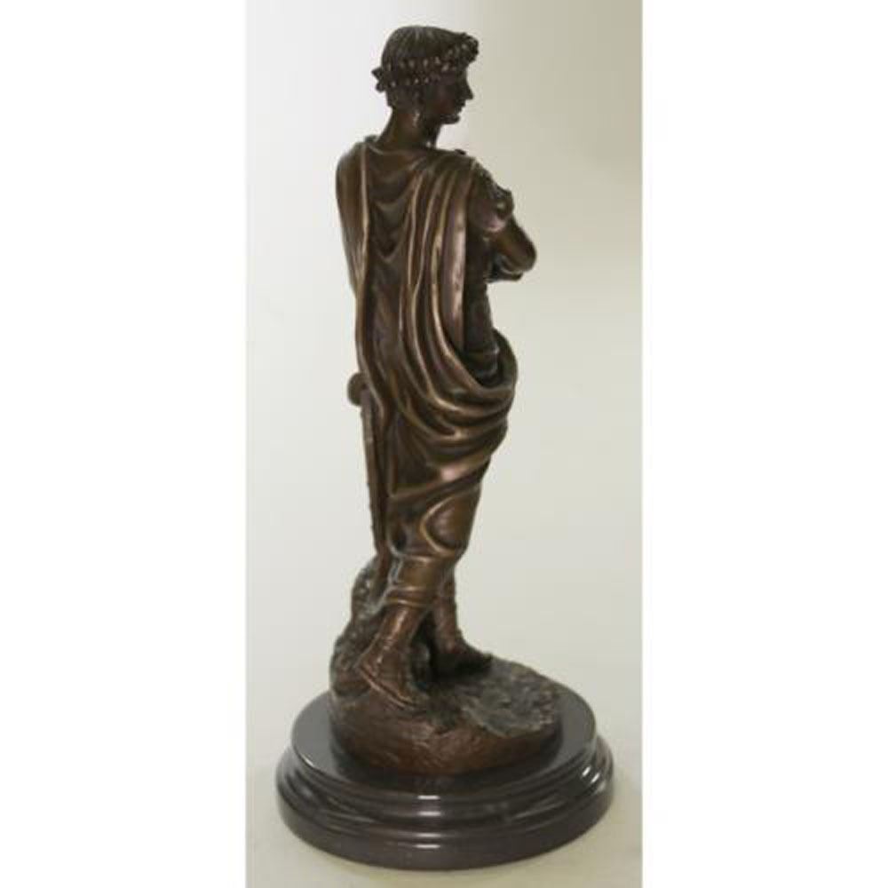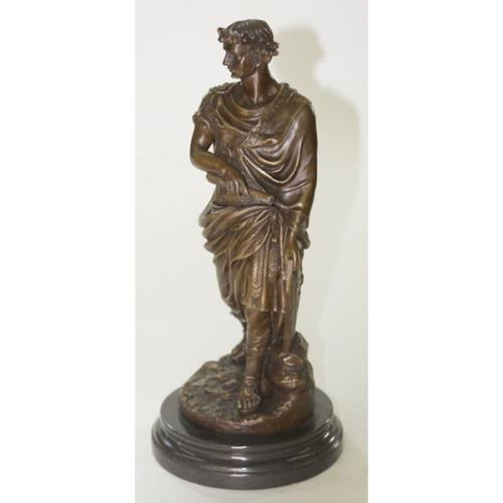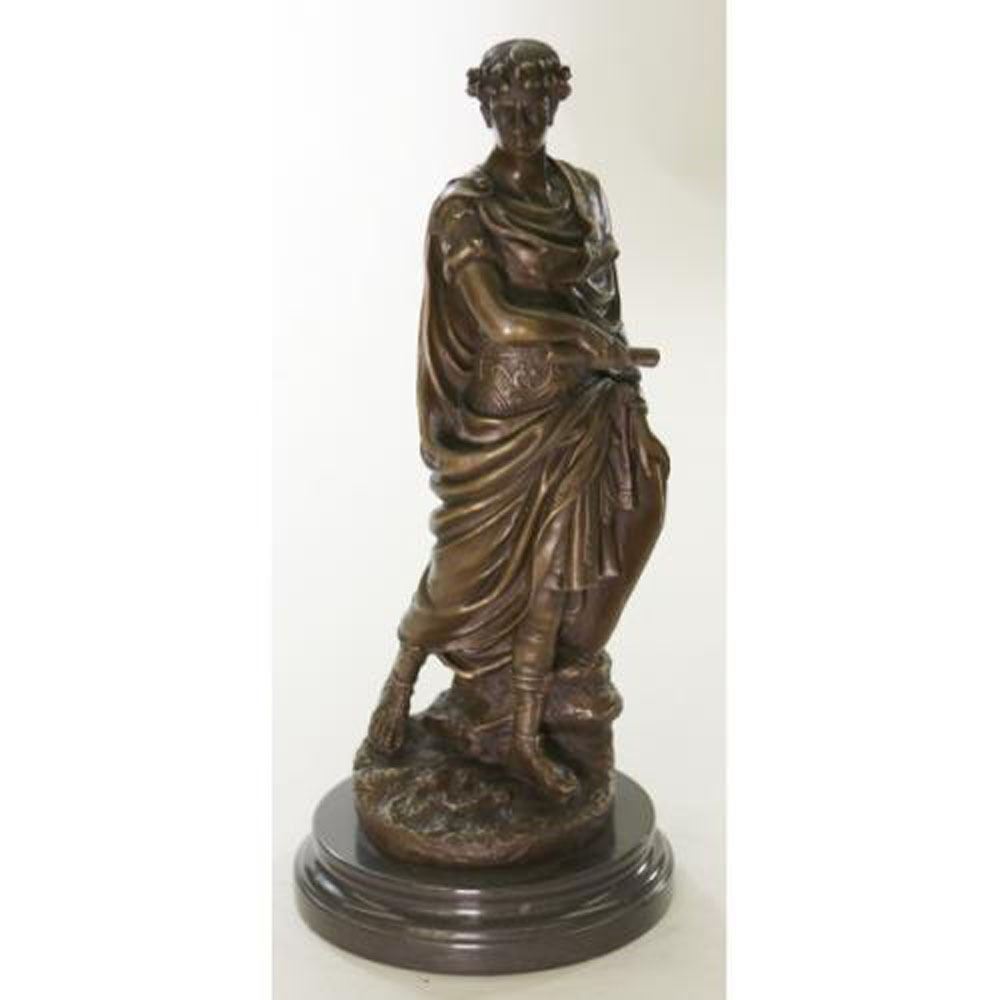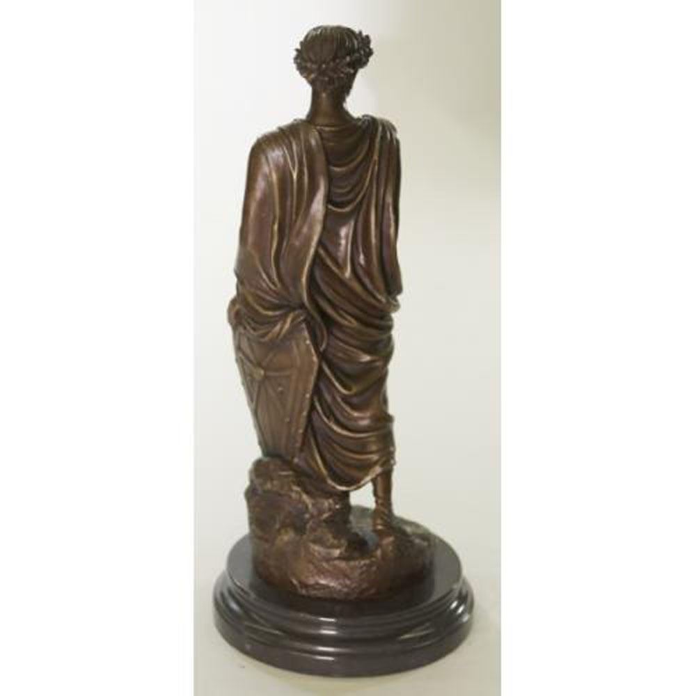 This is a bronze sculpture honoring the eminent Gaius Julius Caesar 13 July 100 BC to 15 March 44 BC. Who was a Roman general and statesman. He played a critical role in the gradual conversion of the Roman Republic into the Roman Empire. He began extensive reforms of Roman society and government. He centralised the bureaucracy of the Republic and was eventually proclaimed dictator in perpetuity. He is seen here in his unrivaled power wearing a generals attire. He wears the chest armor, over what would have been, a wool tunic in a deep purple as used in martial triumphs. He holds a scepter, which is a symbolic ornamental rod or wand borne, in his left hand, significant of a ruling monarch as an item of royal or imperial insignia. His face looks out boldly to the cheering masses, raising his hand in acknowledgment. This icon of the ages was molded using the age old methods of lost wax casting and stained with a brown patina finish and stands upon a marble base. Bronze Dimensions with Marble Base: Height 17 X Width 8 Inches. Weight: 17 LBS.