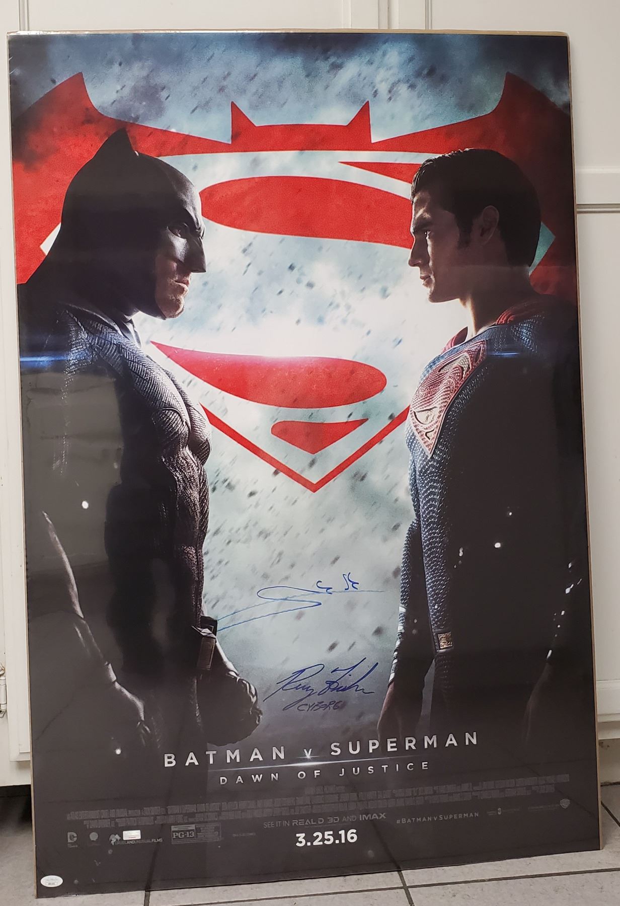 A 27” x 41” movie poster signed by Gal Gadot and Ray Fisher. The autographs are authenticated by JSA who issued a Letter of Authenticity numbered XX91692. The poster advertises Batman v. Superman: Dawn of Justice (2016). The poster features a close-up of Batman (Ben Affleck) facing Superman (Henry Cavill).