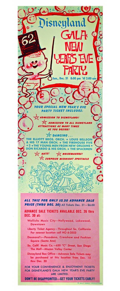 (Disneyland, 1962) Rare gate flyer announcing the 1962 New Year's Eve party at Disneyland. Measures 4.5"x15". in very good condition.