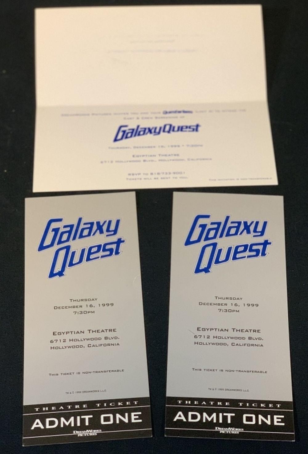 Original pair of tickets and invitation given to a member of the cast and crew for a special screening of the science fiction comedy film "Galaxy Quest" (1999). A parody of and homage to science-fiction films and series, especially Star Trek and its fandom, the film stars Tim Allen, Sigourney Weaver, Alan Rickman, Tony Shalhoub, Sam Rockwell and Daryl Mitchell. It depicts the cast of a fictional defunct cult television series, Galaxy Quest, who are visited by actual aliens who think the series is an accurate documentary, and become involved in a very real intergalactic conflict.