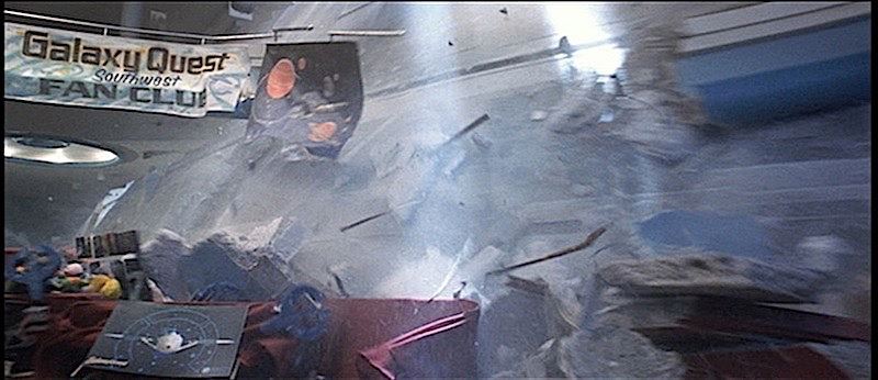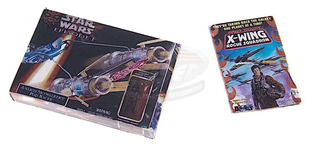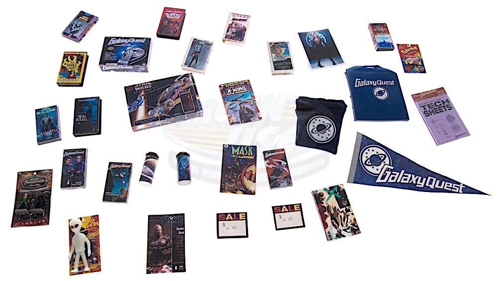 (DreamWorks Skg, 1999) These miniatures were custom-made by the production for miniature effects scenes of the crash sequence into the convention center. The collection of miniatures include twelve video tapes featuring titles like "Galaxy Quest", "Close Encounters of the Third Kind", "Abbott & Costello meet Dr. Jekyll & Mr. Hyde" and others, four comic books, five toys, a navy blue foam cushion with vinyl covering and handle with the "Galaxy Quest" logo on the front, two "Galaxy Quest" canisters, a "Galaxy Quest" pennant, a folded t-shirt, two "sale" signs, "Galaxy Quest" tech sheets package and a poster of Gwen DeMarco (Sigourney Weaver). For reference of size the pennant measures 6" in length. Minor wear from use and storage is present.