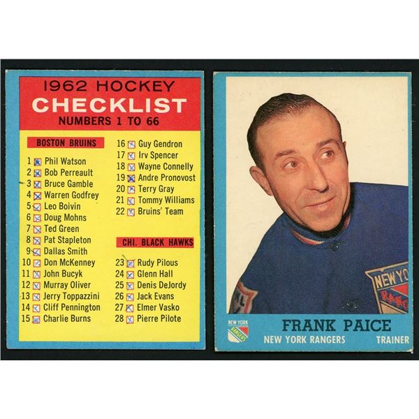 Two cards from the 1962-63 Topps hockey set, includes #61 Frank Paice (Rangers trainer) grades VG-EX (crease free!) and #66 checklist, which is marked