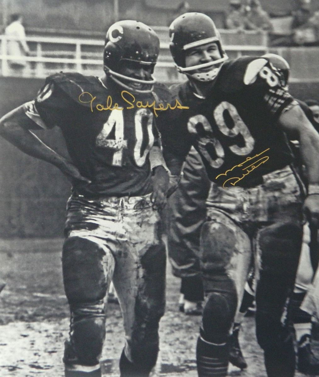 Gale Sayers and Mike Ditka dual signed Chicago Bears standing on field black and white 16x20 photo. Item comes with a Schwartz Sports Memorabilia tamper-proof numbered hologram and Certificate of Authenticity which can be verified online.