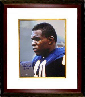 Gale Sayers was, is and will always remain a Chicago Bears legend. Despite a career cut short by knee injuries, the star running back amassed 9,435 yards, 4,935 of them rushing, and scored 336 points. He won Rookie of the Year honors in 1965, played in four Pro Bowls and was enshrined in the Hall of Fame in 1977. Gale Sayers has hand autographed this Chicago Bears 16x20 with HOF 77 Inscription. GTSM Hologram and Certificate of Authenticity from Athlon Sports. Custom White Mat and Premium Mahogany Framed as shown.