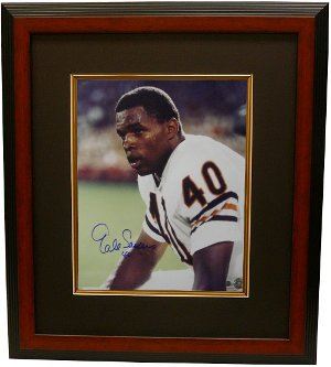 Gale Sayers was, is and will always remain a Chicago Bears legend. Despite a career cut short by knee injuries, the star running back amassed 9,435 yards, 4,935 of them rushing, and scored 336 points. He won Rookie of the Year honors in 1965, played in four Pro Bowls and was enshrined in the Hall of Fame in 1977. Gale Sayers has hand autographed this Chicago Bears 16x20. Sayers Hologram and Certificate of Authenticity from Athlon Sports. Custom Black Mat and Wood Framed as shown.
