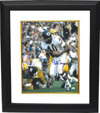 Gale Sayers was, is and will always remain a Chicago Bears legend. Despite a career cut short by knee injuries, the star running back amassed 9,435 yards, 4,935 of them rushing, and scored 336 points. He won Rookie of the Year honors in 1965, played in four Pro Bowls and was enshrined in the Hall of Fame in 1977. Gale Sayers has hand autographed this Chicago Bears 16X20 Photo. JSA Hologram and Certificate of Authenticity from Athlon Sports. Custom White Mat and Premium Black Color Framed as shown