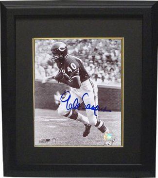 Gale Sayers was, is and will always remain a Chicago Bears legend. Despite a career cut short by knee injuries, the star running back amassed 9,435 yards, 4,935 of them rushing, and scored 336 points. He won Rookie of the Year honors in 1965, played in four Pro Bowls and was enshrined in the Hall of Fame in 1977. Gale Sayers hand autographed Chicago Bears Black & White Vintage 8x10 Photo. Sayers Hologram and Certificate of Authenticity from Athlon Sports. Custom Black Mat and Black Framed as shown.