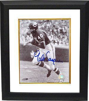 Gale Sayers was, is and will always remain a Chicago Bears legend. Despite a career cut short by knee injuries, the star running back amassed 9,435 yards, 4,935 of them rushing, and scored 336 points. He won Rookie of the Year honors in 1965, played in four Pro Bowls and was enshrined in the Hall of Fame in 1977. Gale Sayers hand autographed Chicago Bears Black & White Vintage 8x10 Photo. Sayers Hologram and Certificate of Authenticity from Athlon Sports. Custom White Mat and Black Framed as shown.