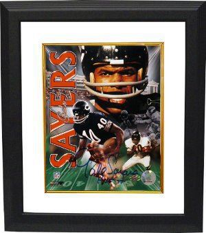 Gale Sayers was, is and will always remain a Chicago Bears legend. Despite a career cut short by knee injuries, the star running back amassed 9,435 yards, 4,935 of them rushing, and scored 336 points. He won Rookie of the Year honors in 1965, played in four Pro Bowls and was enshrined in the Hall of Fame in 1977. Gale Sayers has hand autographed this Chicago Bears Collage 16x20. Sayers Hologram and Certificate of Authenticity from Athlon Sports. Custom White Mat and Premium Black Framed as shown.