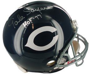 Gale Sayers was, is and will always remain a Chicago Bears legend. Despite a career cut short by knee injuries, the star running back amassed 9,435 yards, 4,935 of them rushing, and scored 336 points. He won Rookie of the Year honors in 1965, played in four Pro Bowls and was enshrined in the Hall of Fame in 1977. Gale Sayers has hand signed this throwback Chicago Bears helmet and he's added the special inscription, "HOF 77." A Sayers Hologram and Steiner Sports Hologram and Certificate of Authenticity is included.