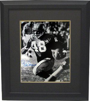 Gale Sayers was a two-time All-American football player at the University of Kansas. During his Jayhawk career, he rushed for 2,675 yards and gained 3,917 all-purpose yards. In 1963, he set an NCAA Division I record with a 99-yard run against Nebraska. In his senior year, he led the Jayhawks to a 15-14 upset victory over Oklahoma with a 96-yard kickoff return. Sayers is considered by many to have been the greatest open field runner in college football history. Gale Sayers has hand autographed this Kansas Jayhawks 16x20 Photo. Custom Black Mat and Black Color Framed as shown. GTSM hologram and Certificate of Authenticity from Athlon Sports