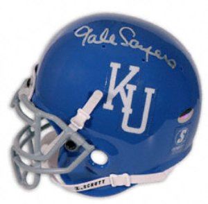Gale Sayers was a two-time All-American football player at the University of Kansas. During his Jayhawk career, he rushed for 2,675 yards and gained 3,917 all-purpose yards. In 1963, he set an NCAA Division I record with a 99-yard run against Nebraska. In his senior year, he led the Jayhawks to a 15-14 upset victory over Oklahoma with a 96-yard kickoff return. Sayers is considered by many to have been the greatest open field runner in college football history. Gale Sayers has hand autographed this Kansas Jayhawks Authentic Helmet. GTSM Hologram and Certificate of Authenticity from Athlon Sports.