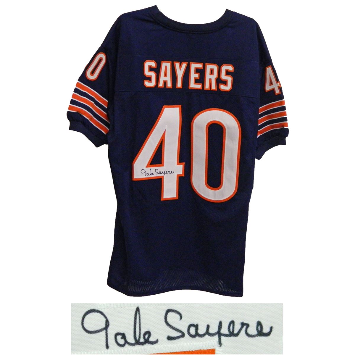 Gale Sayers signed navy custom football jersey. Item comes with a Schwartz Sports Memorabilia tamper-proof numbered hologram and Certificate of Authenticity which can be verified online.