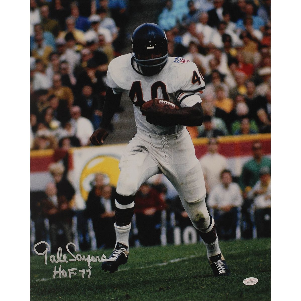 Color satin-finish 16 x 20 photo of Sayers running the ball up the field, signed in silver ink, “Gale Sayers HOF 77.” In fine condition, with a James Spence authentication label affixed to lower corner. Accompanied by a certificate of authenticity from James Spence.