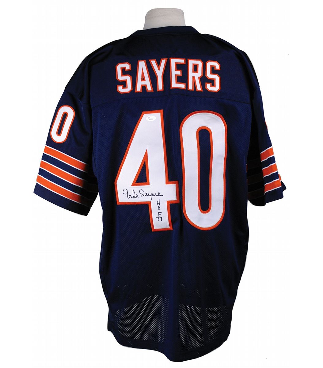 Replica Chicago Bears football jersey, with sewn on letters and numbers, signed in black felt tip on the number on the back, “Gayle Sayers, HOF 77.” In fine condition, with a JSA label affixed to the number. Accompanied by a certificate of authenticity from JSA.