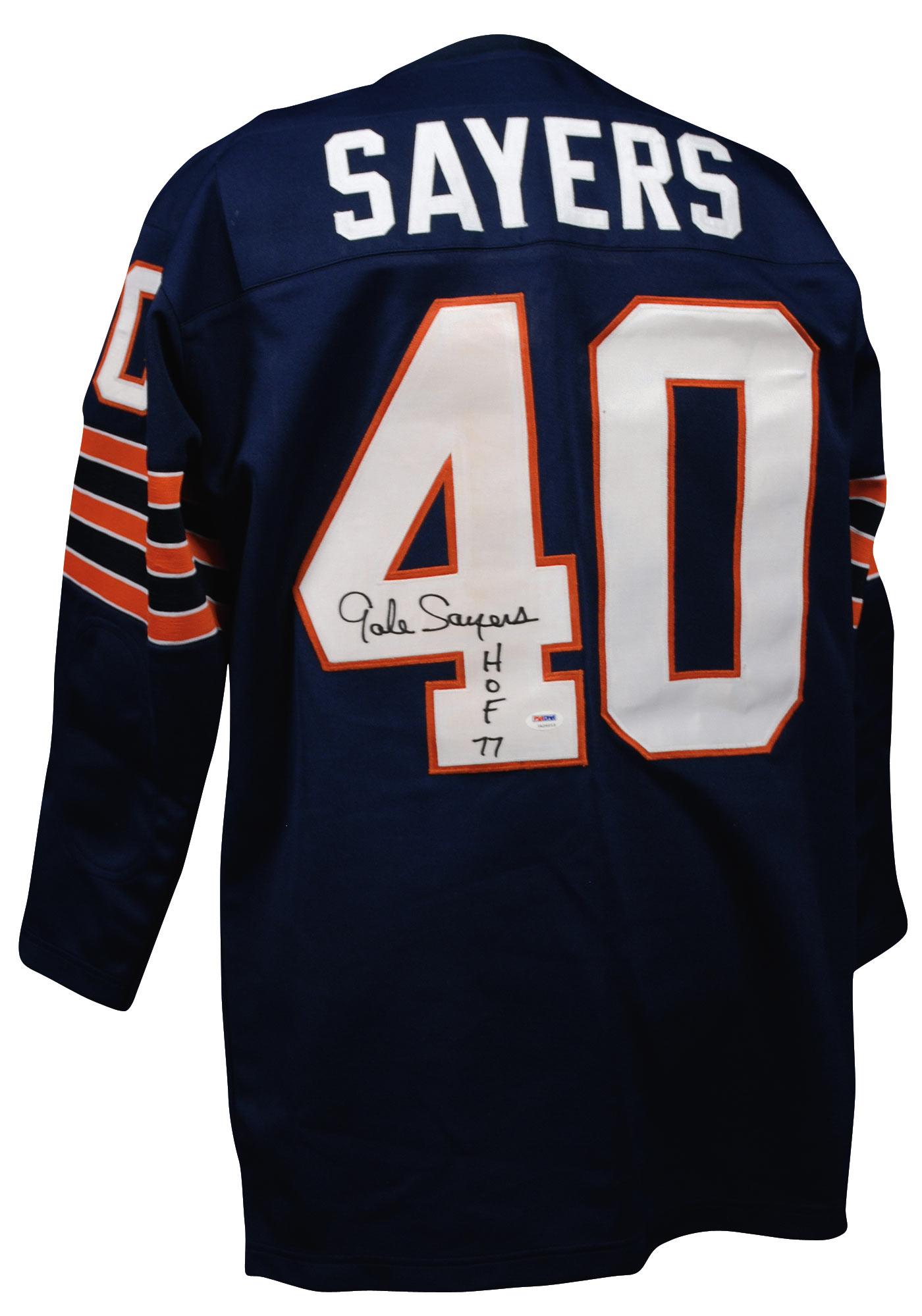 Replica Chicago Bears football jersey, with sewn on letters and numbers, signed in black felt tip on the number on the back, “Gale Sayers HOF 77.” A PSA/DNA authentication label affixed to number. In very fine condition. Pre-certified Steve Grad/PSA/DNA and RRAuction COA.