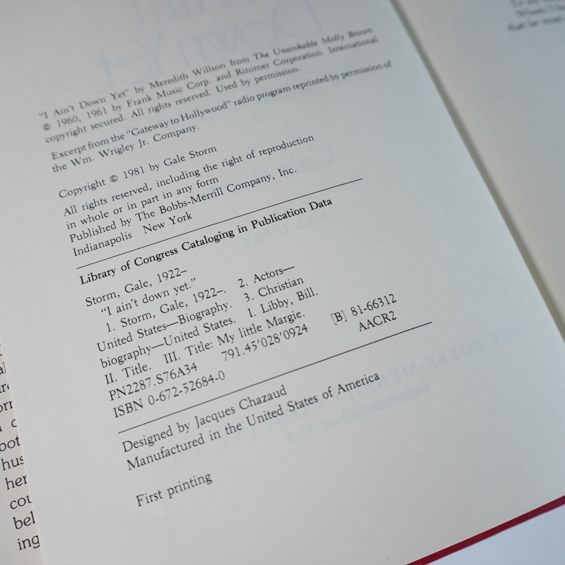 Indianapolis: Bobbs-Merrill Company, 1981. The autobiography of actress and singer Gale Storm, best known for her role in My Little Margie. The book details her career, struggles, and triumphs, co-written with Bill Libby. First printing. 191 pages. ISBN: 0-672-52684-0.