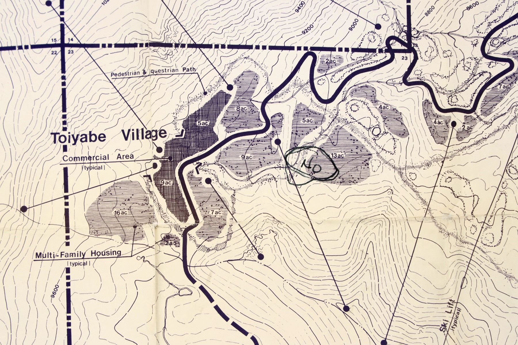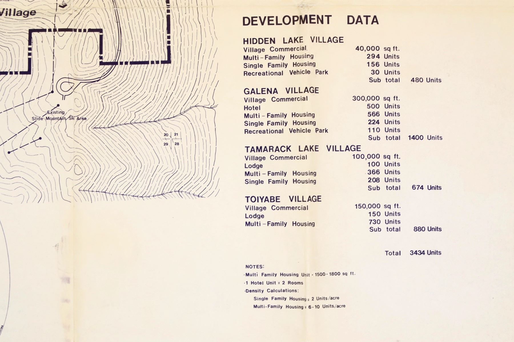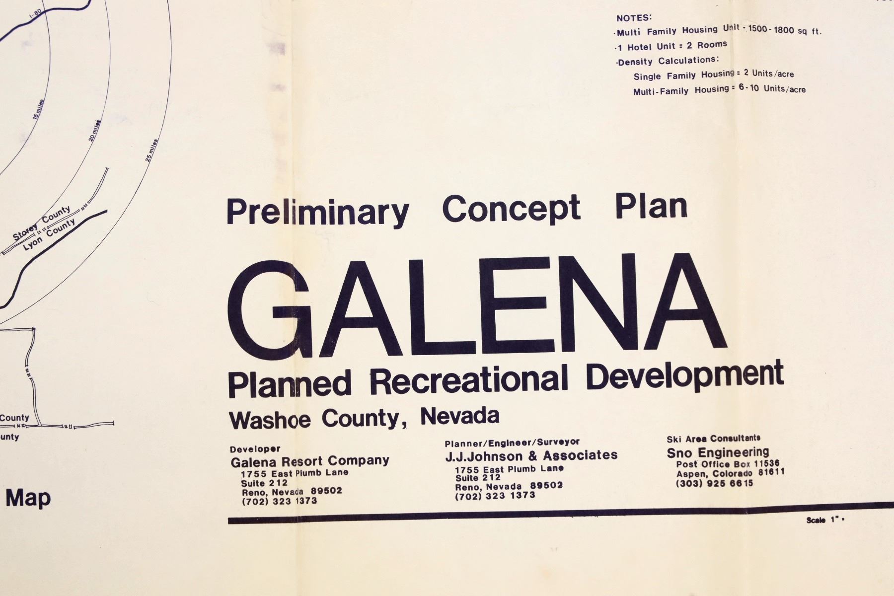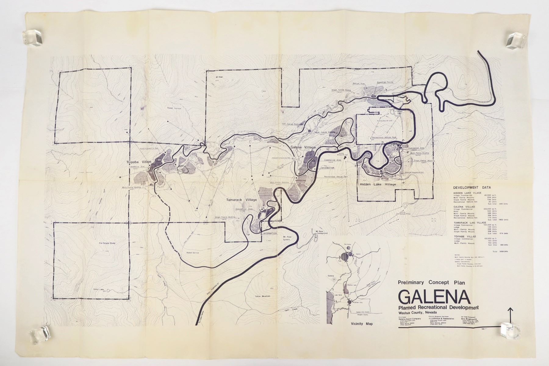 Galena Development Plan Original Blueprint c. 1982. 20 x 30 inches. This map shows the proposed massive development of the upper Mt. Rose area for a ski resort and associated villages. Several dirt roads were cut in preparation, but the project did not move forward after a successful attempt was made to acquire the land and return it to the US Forest Service. As such, this is a very valuable map.