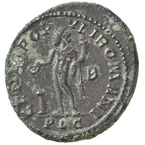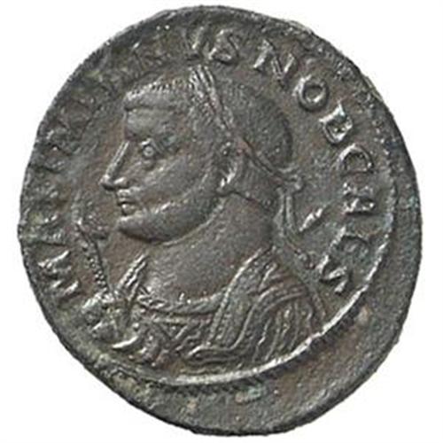 Impero Romano. Galerio (305-311). Follis, Lugdunum. D/ MAXIMIANVS NOB CAES. Busto laureato e paludato a sinistra, con scettro sormontato da aquila. R/ GENIO POPVLI ROMANI. Genio, stante a sinistra, sacrifica con patera su altare e tiene cornucopia. Nel campo a destra, B. In esergo: PLC. RIC 146b. gr. 11.11 AE. qSPL.