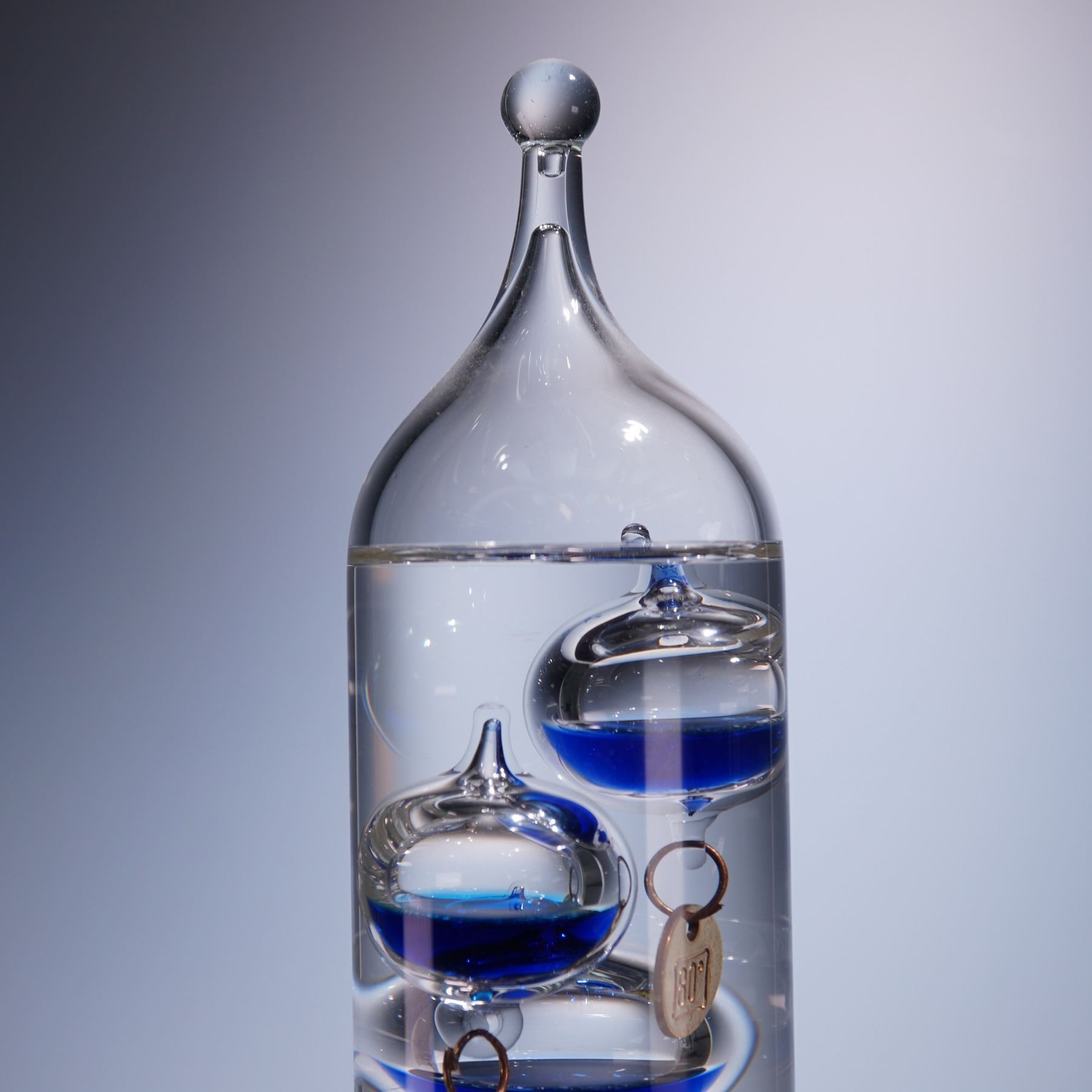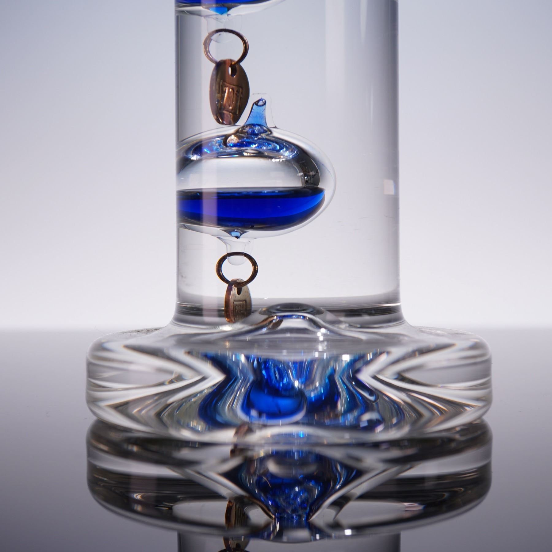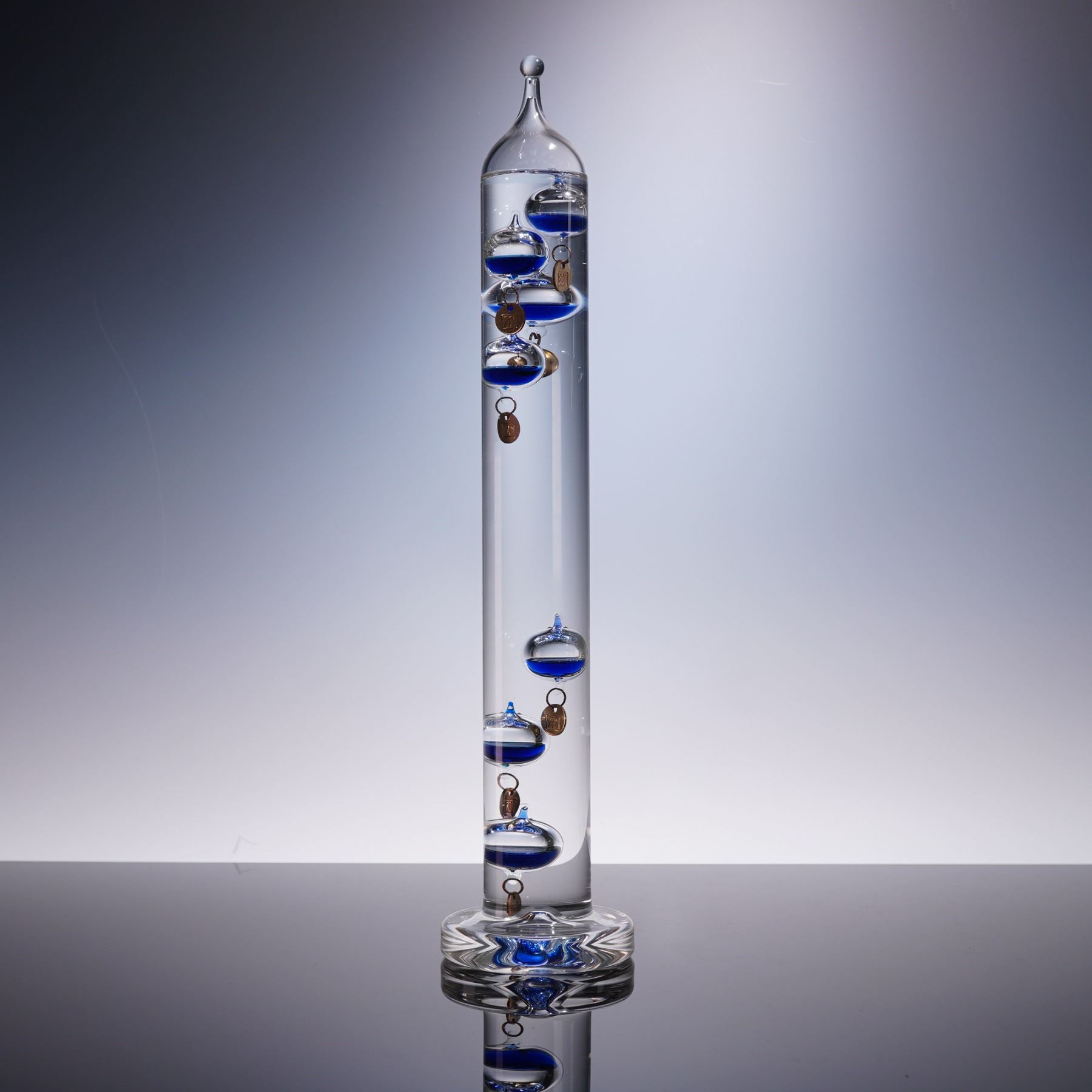 Tall clear glass Galileo thermometer featuring a set of floating blue spheres with gold-tone temperature tags. The cylinder is capped with a rounded finial and supported by a wide, flared base. This scientific instrument combines decorative form with functional temperature reading based on density. Measures 16.5"H.