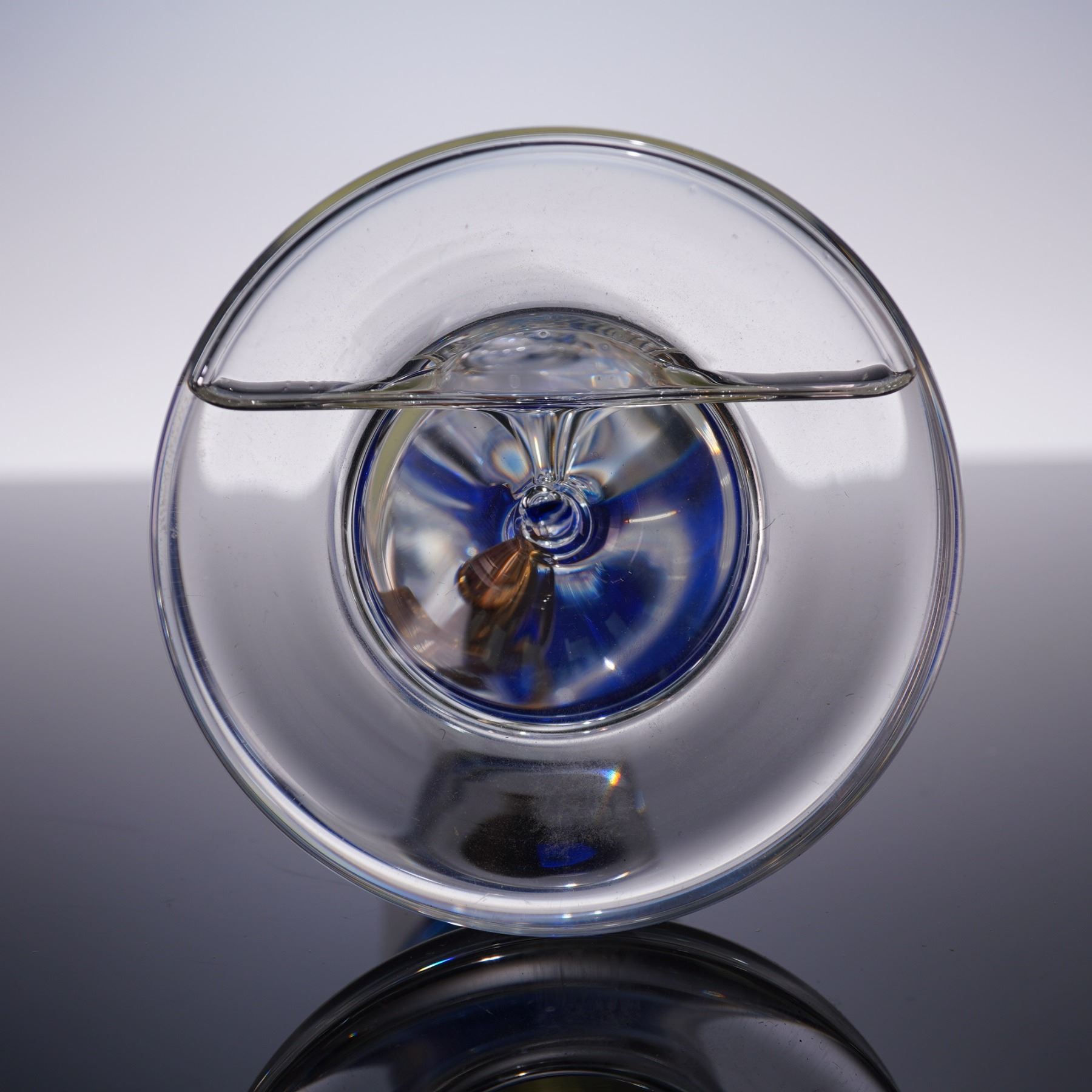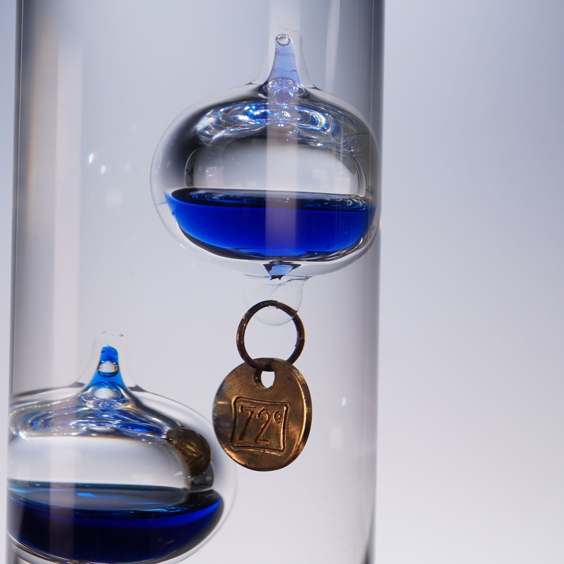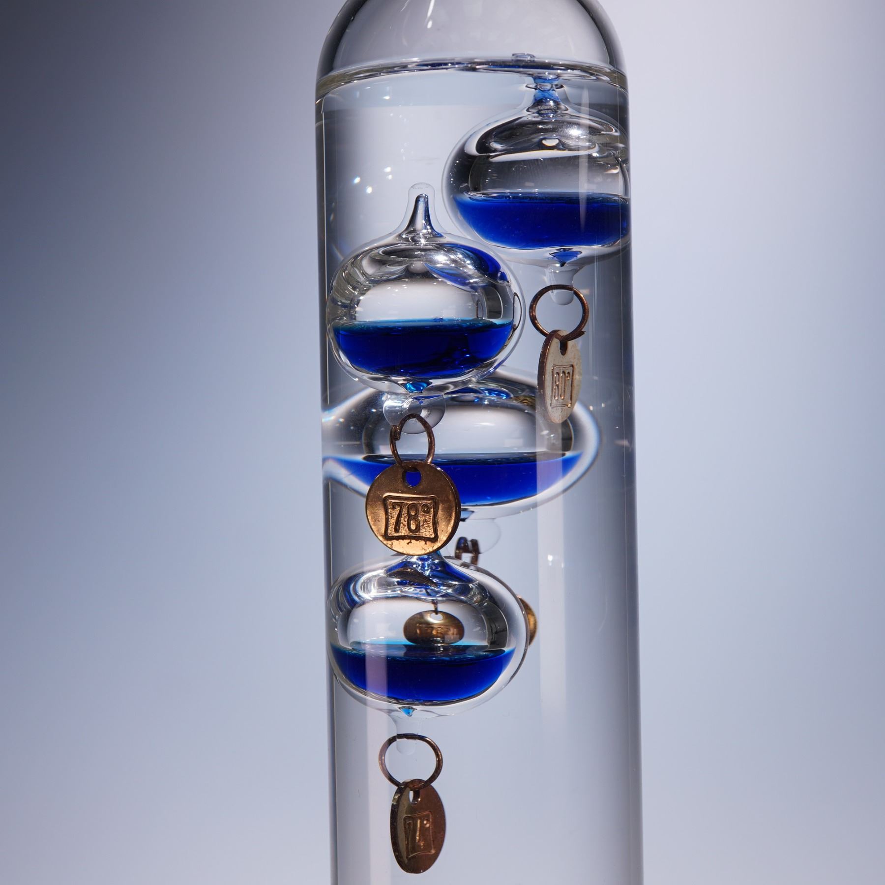 Tall clear glass Galileo thermometer featuring a set of floating blue spheres with gold-tone temperature tags. The cylinder is capped with a rounded finial and supported by a wide, flared base. This scientific instrument combines decorative form with functional temperature reading based on density. Measures 16.5"H.