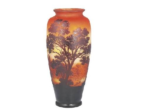 Blown, layered, etched and varnished colour glass. On the surface there is a river landscape with trees. Marked: Gallé. Émile Gallé, Nancy, 1902. Size: 45 cm