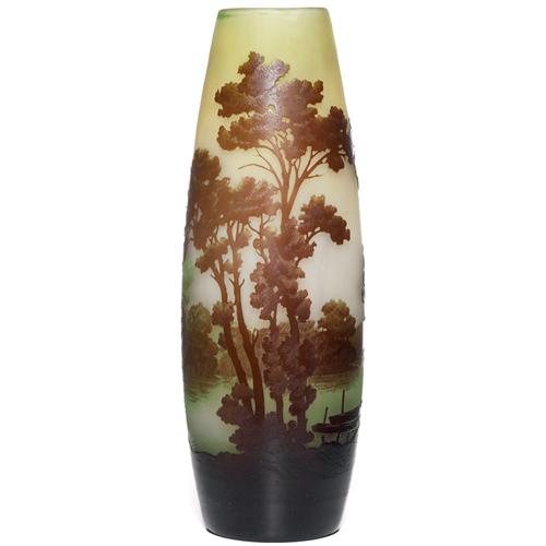 Gallé vase, tapered form with cameo landscape in multiple shades of green against a frosted and green ground, cameo signature, 13"h