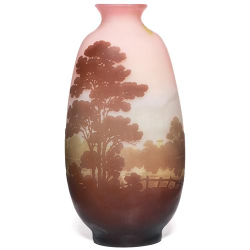 Gallé vase, flattened bulbous form with cameo landscape in brown and green against a pink and frosted ground, cameo signature, 13"h