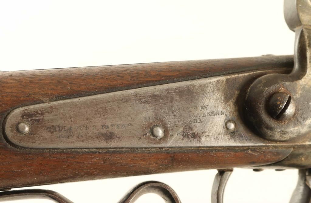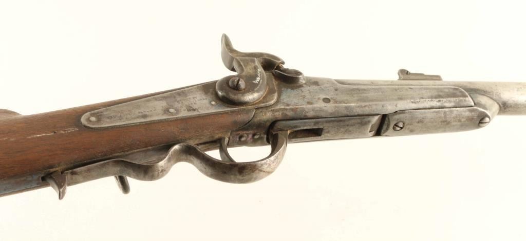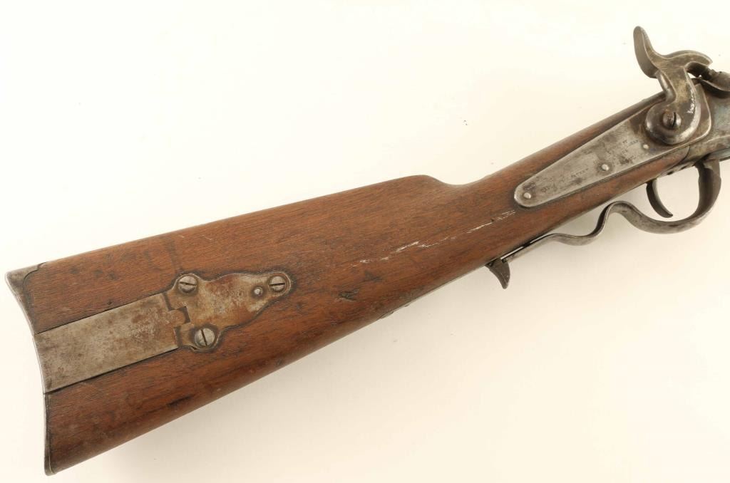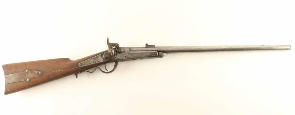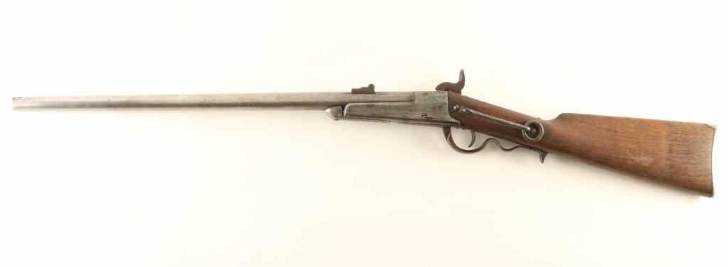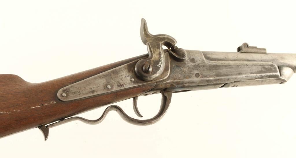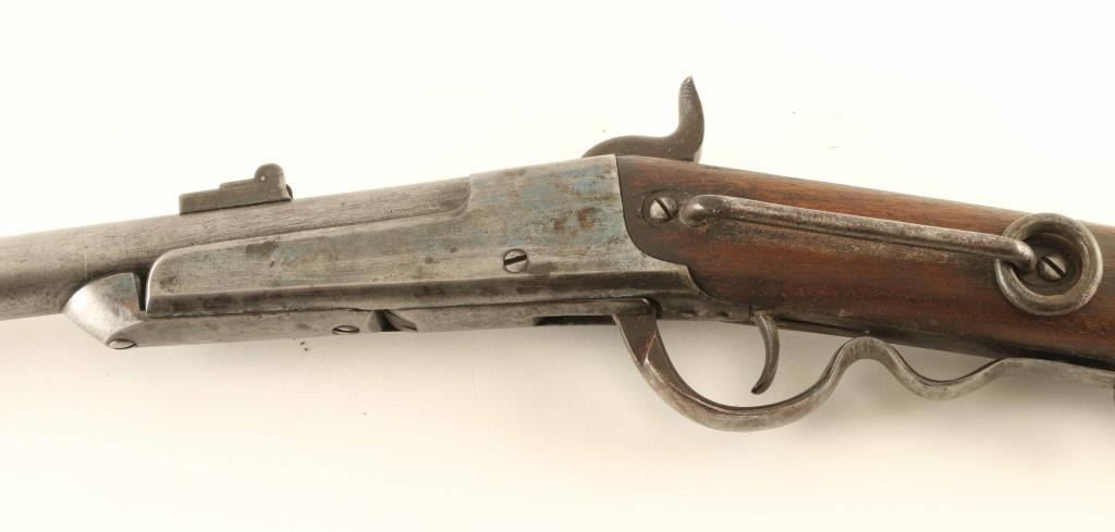 Rifle. Black powder breechloading saddle-ring carbine. Percussion. U.S. Civil War issued. In service 1861. Loaded from the rear with paper backed brass cases. Barrel moves forward, and tilts up, when triggerguard is lowered. Total of 17, 782 were sold to the Union Army, but frequently, cases stuck due to expansion. Only seen service in 1861. 22" round barrel, with 1861 rear 3-leaf sight. Missing front sight. Rifled bore appears good, but dirty. Saddle ring mounted on left side of wrist. Two-cock hammer locks up tight. triggerguard locks in place with catch lever. Walnut stock is good, with patch box on the right. Extra nipple in patch box. Steel buttplate. Masker and patent markings on lock plate are fades, mostly readable. Some surface rust on patch box, hammer, lock plate. Unfortunately, it appears someone has taken steel wool to the metal surfaces, leaving a scratched appearance on the metal. Some traces of blue in recessed areas A somewhat rare carbine. NRA Condition-Good. Antique Firearm.