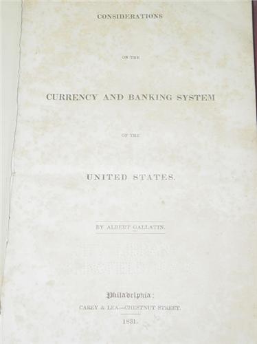 Gallatin, Albert. Considerations On the Currency and Banking System of the United States. Philadelphia: Carey & Lea, 1831. 8vo - over 7¾" - 9¾" tall. Hard Cover. Ex-Library. Fair condition. SCARCE. This essay was prepared for the American Quarterly Review of December 1830. 108pp in a library binding, ffp loose, interior foxing, BINDING TIGHT.