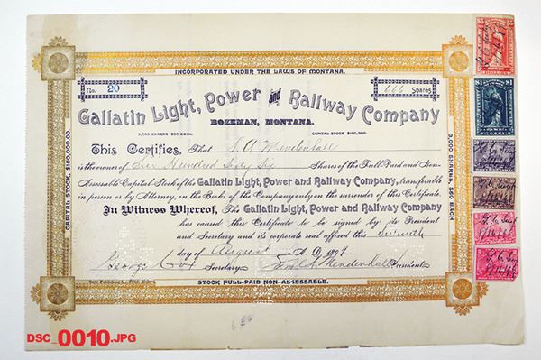 Montana. 666 Shares Capitol Stock, Issued and Canceled, Certificate. Black print with a light brown/orange border with no under tint. No vignette, only company title at top. Multiple revenue stamps along left side of page. Pin punched canceled. VF condition.