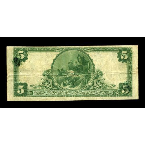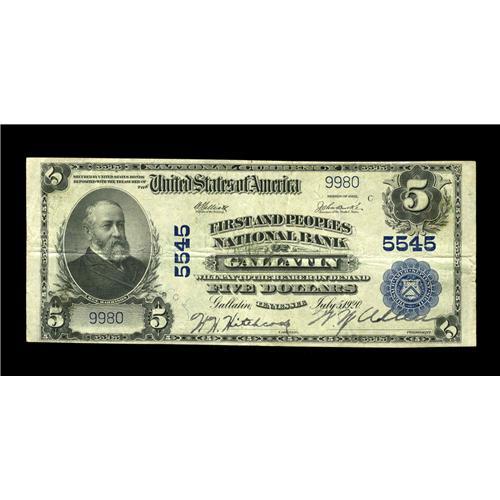 <B>Gallatin, TN</B></I> - $5 1902 Plain Back Fr. 607 <B>First & Peoples NB </B></I> Ch. # 5545<BR>A nice grade large example from this very tough bank. <B>Very Fine,</B></I> with clear black signatures. There is one small ink mark on the back which barely detracts.